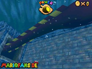 Gehe Richtung Schiffswrack. Rechts auf der Plattform findest du eine weitere rote Kiste. Mit der Blume wirst du zu Metall-Wario. Spring nun ins Wasser auf den Grund des Sees. Als Metall-Wario sinkst du zu Boden und kannst in dem Luftstrudel den Stern einsammeln.