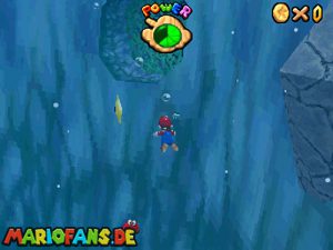 Sobald ihr gelandet seid, geht ins Wasser und schwimmt ein wenig, so lange bis ihr zu einer großen offenen Wasserstellen kommt. Holt euch noch einmal frische Luft, und danach taucht in die Tiefe, bis ihr ein versunkenes Schiff seht. Sucht nach der Mitte des Schiffs und schaut dann nach rechts, dort ist Kano der Aal. Er bewacht den Eingang. Schwimmt ein wenig vor ihm her, danach schwimmt wieder nach oben. Jetzt müsste der Eingang zum Schiff frei sein. Wenn nicht, wiederholt ihr dies solange bis Kano den Weg zum Eingang frei macht. Im Schiff findest du eine Kiste. Schwimm gegen das Schloss um sie zu öffnen, damit das Wasser aus dem Wrack absinkt. Jetzt kannst du langsam nach oben klettern und den Stern aus der Kiste holen.