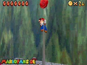 Rechts findest du eine rote Kiste. Schnapp dir die Blume und du verwandelst dich in einen Ballon. Nun schweb zügig zu den hinteren Steinsäulen, wo dir auf der Karte auch der Stern angezeigt wird. Drücke die Schultertaste, um wieder normal zu werden und schnapp dir dann den Stern.