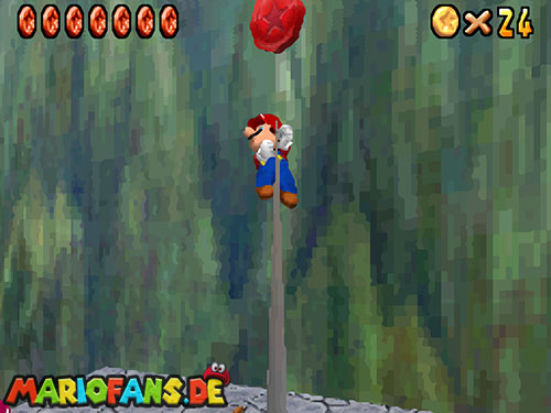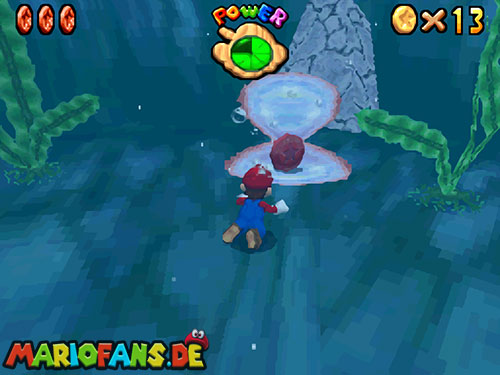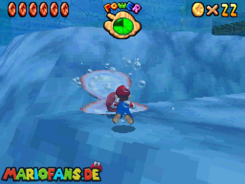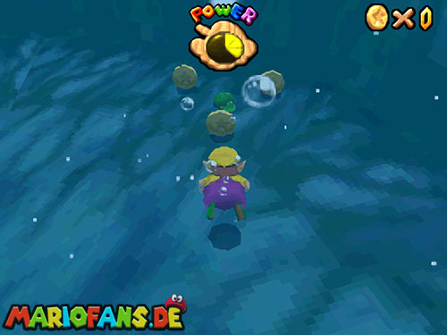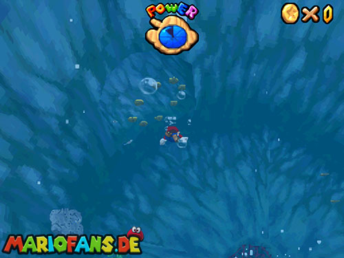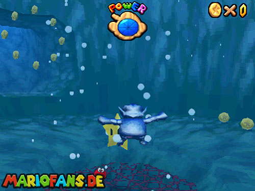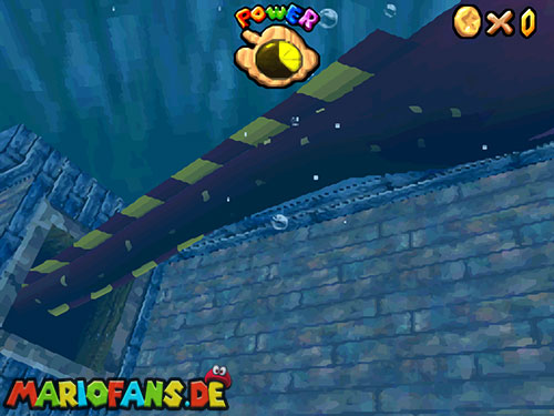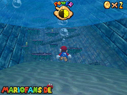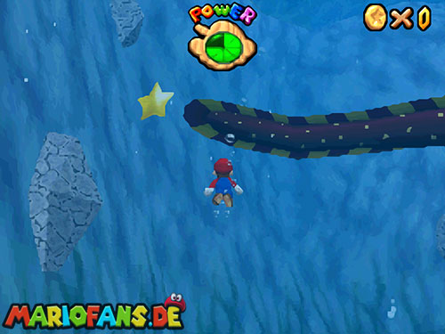 Sobald ihr gelandet seid, geht ins Wasser und schwimmt ein wenig, so lange bis ihr zu einer großen offenen Wasserstellen kommt. Holt euch noch einmal frische Luft, und danach taucht in die Tiefe, bis ihr ein versunkenes Schiff seht. Sucht nach der Mitte des Schiffs und schaut dann nach rechts, dort ist Kano der Aal. Er bewacht den Eingang. Schwimmt ein wenig vor ihm her, danach schwimmt wieder nach oben. Jetzt müsste der Eingang zum Schiff frei sein. Wenn nicht, wiederholt ihr dies solange bis Kano den Weg zum Eingang frei macht. Im Schiff findest du eine Kiste. Schwimm gegen das Schloss um sie zu öffnen, damit das Wasser aus dem Wrack absinkt. Jetzt kannst du langsam nach oben klettern und den Stern aus der Kiste holen.