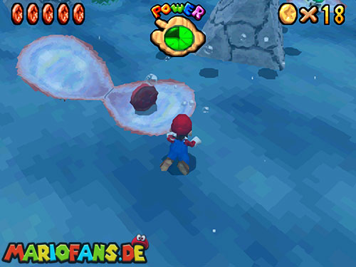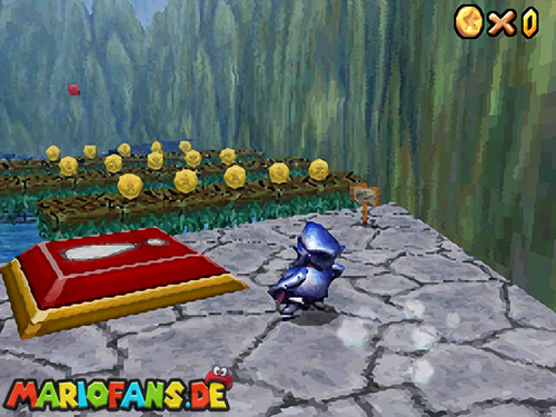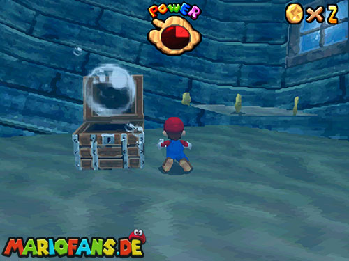Gehe Richtung Schiffswrack. Rechts auf der Plattform findest du eine weitere rote Kiste. Mit der Blume wirst du zu Metall-Wario. Spring nun ins Wasser auf den Grund des Sees. Als Metall-Wario sinkst du zu Boden und kannst in dem Luftstrudel den Stern einsammeln.