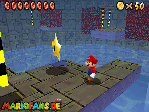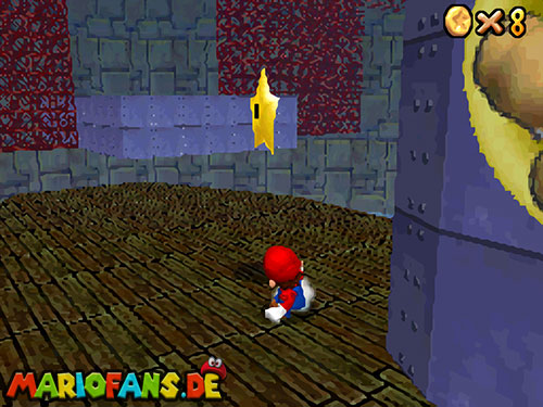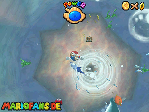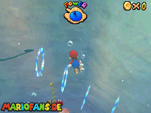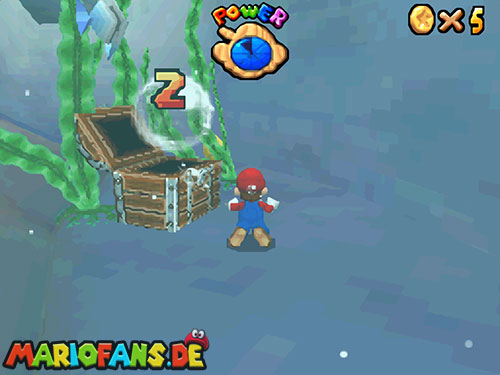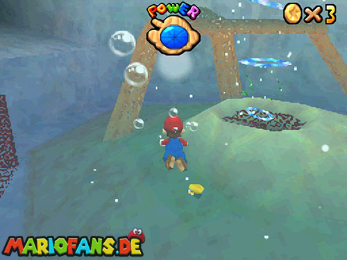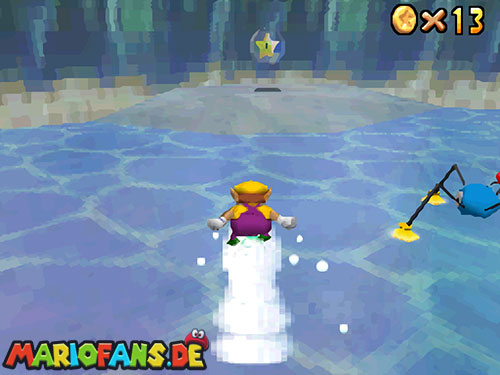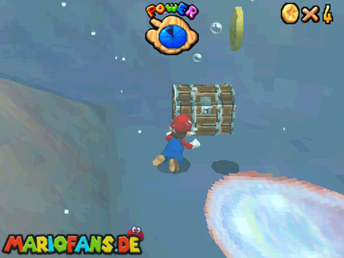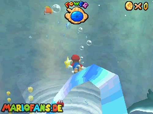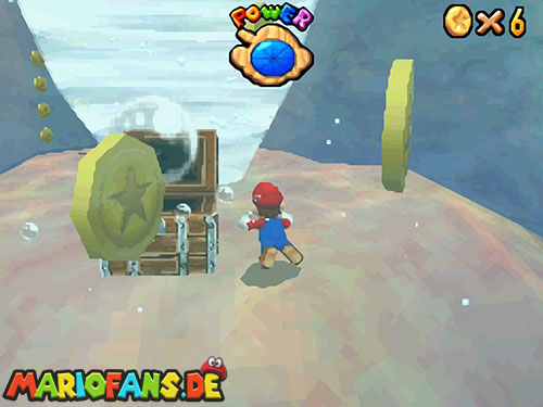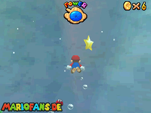 Nachdem ihr in das Level gesprungen seid, landet ihr im Wasser. Taucht (B/A) nun bis fast auf den Grund, dort findet ihr ein Loch, taucht durch das Loch. Weiter hinten seht ihr Pfeile, folgt diesen, bis ihr aus der Höhle wieder raus seid. Schwimmt an die Oberfläche und sucht einen kleinen Aufgang. Geht ihr dann am Rand entlang, findet ihr einen !-Schalter. Springt ihr auf diesen, aktiviert ihr Blöcke, die euch auf das U-Boot führen. Jetzt müsst ihr nur noch den Stern auf dem U-Boot finden.