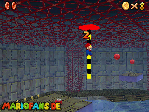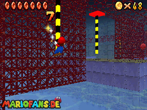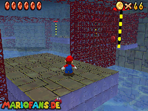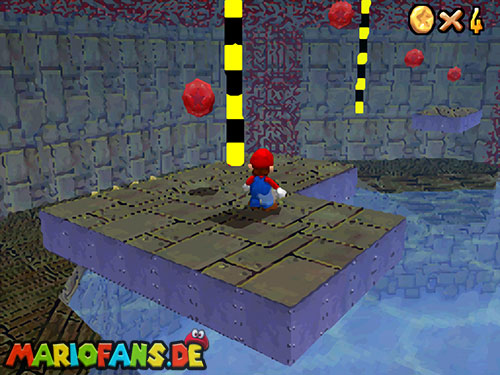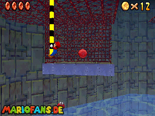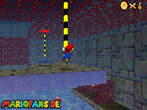 Ihr müsst wieder zu der Stelle wo auch Bowser U-Boot war (siehe Mission 1). Wenn ihr am Rand gehen könnt, aktiviert den !-Schalter um wieder Blöcke sichtbar zu machen. Wo ein kleiner Aufgang ist, kommt ihr am besten nach oben. Sammelt auf der Plattform die rote Münze ein (1). Springt nun an die fahrbare Stange. Klettert ein wenig nach oben um die rote Münze zu erwischen (2). Klettert wieder ein wenig nach unten um die andere Münze (3) zu bekommen. Ihr müsst nicht unbedingt auf die Plattform springen, wenn ihr weit genug unten an der Stange hängt, könnt ihr auch die Münze (4) erwischen. Fahrt wieder bis zur Ausgangsplattform zurück. Nehmt nun die andere Stange die euch weiter in den Raum führt. Falls ihr die Stange verpasst, könnt ihr mit einem Hechtsprung (Z+A) hinterher springen. Springt auf die Plattform und geht geradeaus weiter zur nächsten Stange. Ihr seid jetzt fast am Ende. Jetzt müsst ihr in der Luft die Stange tauschen (A), dreht euch so, dass der Rücken zur Stange zeigt. Der schwierigste Teil kommt jetzt, die Stange gegenüber müsst ihr gut erwischen, die beiden Stangen sind nie genau Parallel! Habt ihr die drei roten Münzen dort eingesammelt, müsst ihr wieder zu großen Plattform (mit dem Stern). Nehmt nun die letzte Stange, ihr müsst ein paar Mal die Stange wechseln bis ihr da seid. Auf der Plattform könnt ihr den Schalter mit einer Stampfattacke (A+Z) aktivieren, falls ihr die Stange verpasst habt, um euch mehr Münzen zu holen. Habt ihr auch die letzte Münze aus dem „Käfig“, müsst ihr nur noch zum Stern. Falls ihr runterfallt, schwimmt wieder ans Ufer und beginnt am besten dort wie am Anfang!