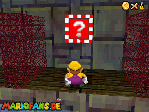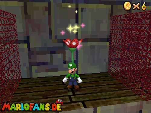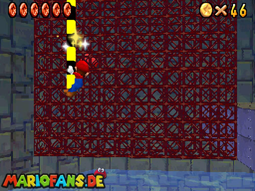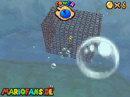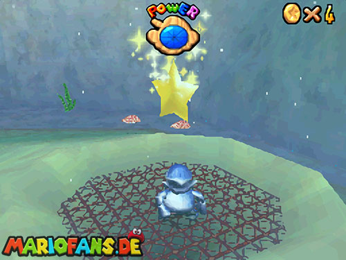 Dies ist ebenfalls eine schnelle Mission. Schwimmt wieder zu der Stelle wo Bowsers U-Boot war. Auf dem Gitter links kannst du Luigis Mütze finden. Geht am Rand entlang und sucht den roten Block. Taucht als unsichtbarer Luigi zum Gitter und hol dir den Stern.