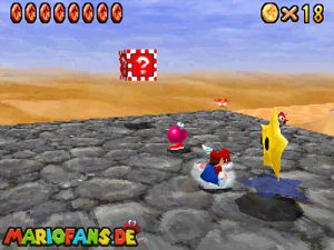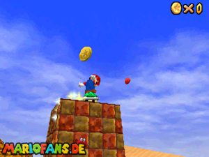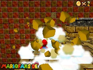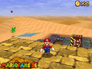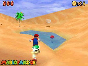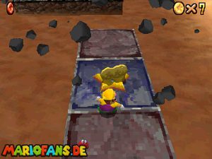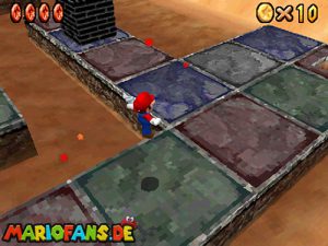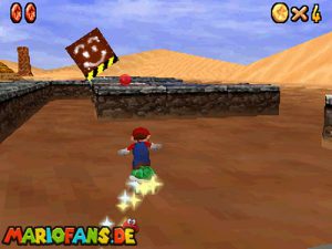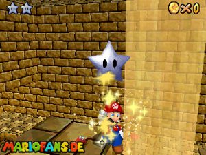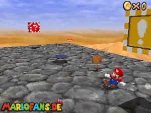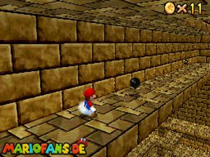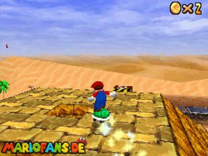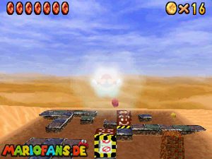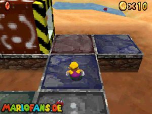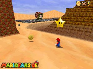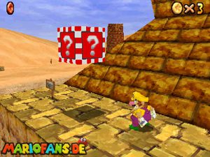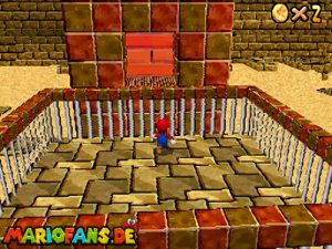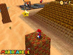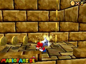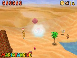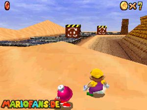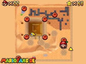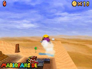 Sobald ihr durch die Wand gesprungen seit, müsst ihr geradeaus zum Pokey gehen. Wenn ihr diesen zerstört könnt ihr eine blaue Münze erhalten. Mithilfe des Shy Guys ist es möglich das Leben über dem Sandstrudel zu bekommen.* Geht nun zu dem kleinen Wüsten Labyrinth. Ihr müsst so gehen das ihr nicht platt gedrückt werdet, ein Treffer besiegt euch nicht sofort. Fallt nicht in den Treibsand, sonst müsst ihr das Level nochmal betreten. Der Ausgang befindet sich links! Habt ihr das Labyrinth durchquert, solltet ihr erstmal mit dem Bob-omb reden, dieser öffnet die Kanone. Dann geht auf den Turm, ja das funktioniert. Wenn der Geier über euch ist, müsst ihr nur noch gegen ihn springen. Den Stern könnt ihr zwischen den beiden Türmen abholen.