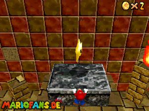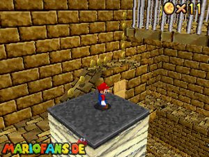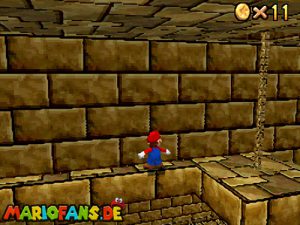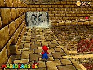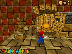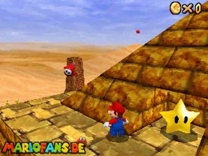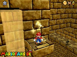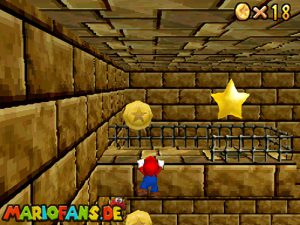 Begebt euch wieder zum Eingang der Pyramide. Diesmal geht hinein. Drin müsst ihr nach rechts gehen*. Folgt dem Weg, passt auf das ihr ab der einen Stelle nicht zerstampft werdet. Seid ihr eine Etage höher, müsst ihr wieder dem Weg folgen. Am Gitter müsst ihr euch die Münzen nicht holen, ihr fallt eher runter. Auch das Leben bekommt ihr nicht im Guten. Passt diesmal auf, das ihr nicht eingeklemmt werdet. Wenn ihr die Stange hochklettert, könnt ihr in der Ecke einen Teleporter finden, welcher euch zum 1-Up Pilz bringt, aber nicht mehr zurück. Wieder in der 2. Etage, müsst ihr euch an das Gitter hängen und euch rüber hangeln. Oder ihr nehmt mit einem Hechtsprung (laufen+Z+A) eine kleine Abkürzung und lauft dann auf dem Sandstrom entlang. In der 3, Etage müsst ihr aufpassen, das ihr nicht platt gewalzt werdet. Entweder Ihr überspringt die Rolle oder ihr versteckt euch im Loch, was dafür vorgesehen ist. Habt ihr ein wenig Schaden erlitten, könnt ihr euch nun am Herz aufladen. Wenn ihr das Treppenspiel überwunden habt, müsst ihr den Weg entlang laufen und dann Vorsichtig euch an der Wand vorbei tasten. Passt auf das euch nicht die Elektronen treffen! In der 5. Etage könnt ihr entweder den „Stampfo“ überspringen oder durchlaufen wenn er in der Luft ist. Vorsicht Absturz Gefahr! Die Münzen zeigen euch dann den Weg zum Stern.