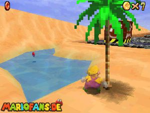 Etwa Mittig ist Nummer drei. Durch Sprünge kann der Weg abgekürzt werden. Verlasst das Labyrinth zum pinken Bob-omb. Rechts von diesem ist ein Wasserbecken. Münze Nummer 4 ist im Wasser. Wenn ihr euch ein bisschen umschaut, seht ihr eine Palme. Stellt euch unter diese, so das ihr von der Wasserseite untersteht. Ihr werdet nun zur Kanone teleportiert.