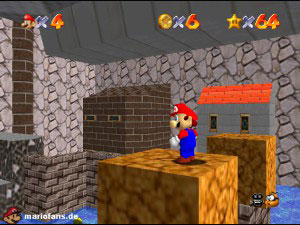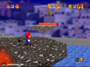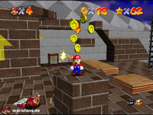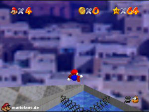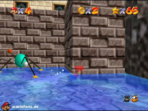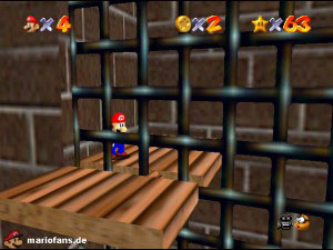 Schwimmt vom Startpunkt aus geradeaus. Nehmt den Aufgang nach oben. Schiebt oben den Eisenblock in der Ecke, etwas nach vorne und springt dann auf den Eisenblock um einen Rückwärtssalto zu machen. Vollführt vom Vorsprung noch einen Salto. Geht jetzt nach rechts. Am Ende des Weges könnt ihr wieder die Wasserhöhe einstellen, tut das auch. Geht nun auf die andere Seite auf das Holzbrett. Überquert es und geht weiter zum nächsten Block. Dreht die Kamera (C-Knöpfe) ein wenig und springt nun auf den drehenden Block. Ein weiterer Sprung und ihr seid beim Stern.