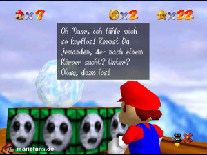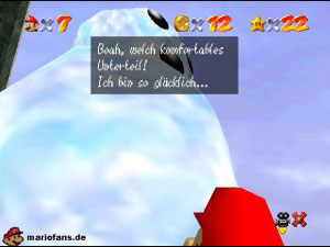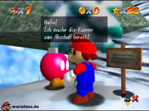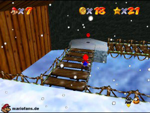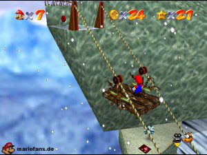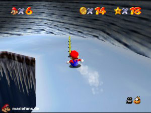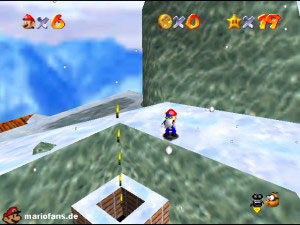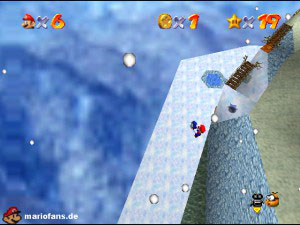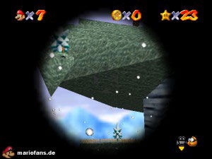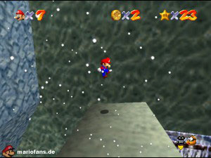 Benutzt die Abkürzung mit der Brücke um nach unten zu kommen. Unten geht zur Kanone die euch der rosa Bob-omb geöffnet hat. Visiert mit der Kanone erst den Tannenbaum in der Spalte an, und geht dann mit der Kanone bis an die Felswand. Jetzt landet ihr etwa knapp auf dem Boden. Danach lauft nach rechts. Dort ist ein enger Weg mit Monstern, überspringt diese und lauft den Weg weiter. Auf dem Schild steht die Erklärung für den Weitsprung (Z+A). Diese braucht ihr um über den Abgrund zu kommen. Dann geht weiter den Weg lang. Bis zur Wand nehmt ihr Anlauf, springt vor der Wand ab und nochmal an der Wand (Wandsprung 😉 ). So gelangt ihr auf die nächst Plattform, Übung mach den Meister!! Für den nächsten Sprung müsst ihr bei einen Dreisprung den Wandsprung vollführen. Dies ist sehr schwer, fallt ihr runter, könnt ihr euch am Herz regenerieren. Habt ihr diese schwere Aufgabe gelöst, geht auf das Eisfeld, „Vorsicht rutsch Gefahr!“, und holt euch den Stern.