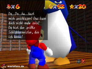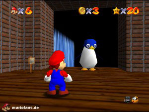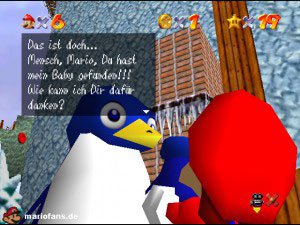 Wieder in der Welt, geht zum Schornstein, aber nicht rein. Ein wenig neben dem Schornstein ist ein kleiner Pinguin, schnappt ihn euch (B-Knopf), und geht mit ihm zum Anfangspunkt. Rechts findet ihr ein zerstörte Brücke, springt dort hinunter, Ihr landet auf einem Vorsprung, dort findet ihr auch noch ein extra Leben. Geht mit dem Baby Richtung rote Münze zum Abgrund, dort seht ihr wieder eine zerstörte Brücke, springt hin und geht auf die Brücke. Ihr müsst jetzt rechts runter springen. Entweder landet ihr schon bei der Mutter, oder ihr müsst erst mit dem Baby hingehen, je nachdem wie weit rechts ihr gesprungen seid. Habt ihr der Mutter das Baby gegeben, belohnt sie euch mit einen Stern.