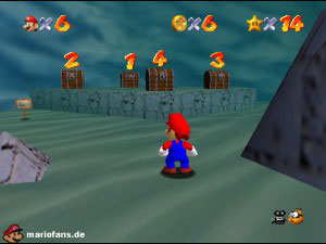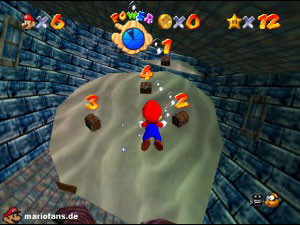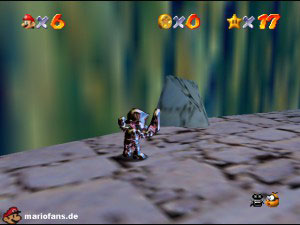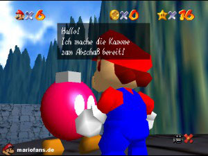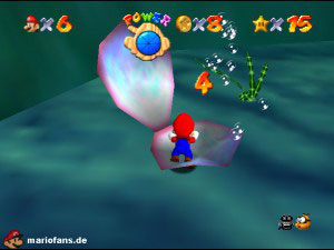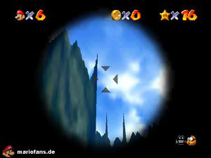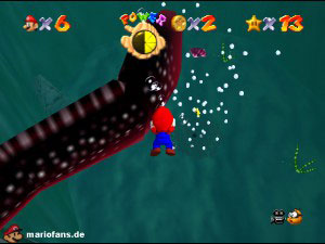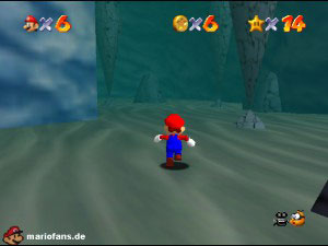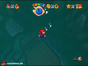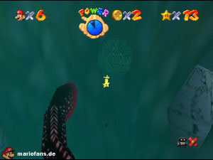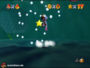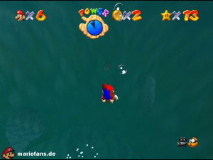 Geht wieder ins Wasser, taucht aber diesmal nur nach vorne zu den Muscheln, denn diese enthalten schon die ersten roten Münzen. Von euch aus gesehen die linke Muschel und die Muschel vor dem Abgrund sind mit roten Münzen versehen. Taucht in den Abgrund bis zum Grund, dort findet ihr wieder eine Muschel mit der dritten roten Münze. Jetzt könnt ihr wieder zu den anderen dreien schwimmen wo es auch schon rote Münzen zu finden gab. Ihr seht am Rand eine kleine Sandbank, in dieser befindet sich auch eine Muschel mit der vierten roten Münze. Geht ans Ufer und sucht den pinken Bob-omb, welcher die Kanone öffnet wenn ihr mit ihm redet. Klettert bei dem Bob-omb an den Pfahl der aus dem Wasser schaut bis zur Spitze, denn dort ist wieder eine rote Münze. Die letzten drei roten Münzen findet ihr auf dem Schiff, ihr gelangt entweder mit der Kanone zum Schiff, oder ihr benutzt den Land weg. Dieser ist ein wenig komplizierter, ihr müsst einen Schalter betätigen damit Blöcke erscheinen, die euch über das Wasser bringen. Auf dem Schiff findet ihr am Buck (vorne) eine rote Münze und am Heck (hinten auf der Erhöhung) zwei rote Münzen. Der Stern erscheint auch auf dem Schiff.