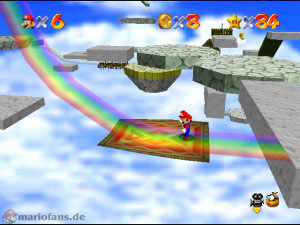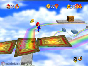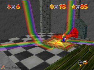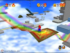 Reise wieder zu der Stelle, wo du dich zwischen den beiden Teppichen entscheiden musstest, wähle diesmal den anderen. Auf diesem Weg musst du mit einem Rückwärtssalto (Z + A) über die Glas-Blöcke springen oder du kletterst erst auf die Plattformen und dann auf die Blöcke. Sobald du im Haus bist, musst du kurzzeitig den Teppich verlassen, damit dich der Kamin nicht mit seinen Flammen erwischt. Wenn du wieder draussen bist, musst du erneut über Glas-Blöcke springen. Kurz vorm Ziel geht es nochmal ins Haus und ans Feuer ran, hier gut aufpassen und den Teppich nicht wegfahren lassen. Am Ende des Regenbogens erwartet dich dann der Stern.