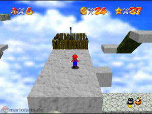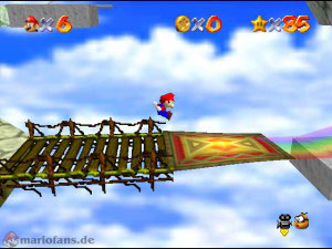 Sobald du ins Bild gesprungen bist, gehe auf den fliegenden Teppich. Springe über die Hindernisse und weiche dem Feuer aus, aber bleib nicht zu lange vom Teppich, denn sonst verschwindet dieser. Hast du den ersten Abschnitt geschafft, dann gehe auf die drehenden Plattformen zum nächsten Teppich. Wieder musst du über ein paar Blöcke springen, am Ende der Strecke hast du die Wahl zwischen zwei Teppichen, je nach Blickrichtung musst du den linken bzw. rechten wählen. Nicht den der zu Glasblöcken führt! Noch einmal geht es aufwärts bis zum Luftschiff, dort wehen starke Winde! Gehe langsam zum Bug und spring dort rauf. Jetzt nur noch den Stern schnappen.