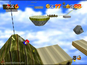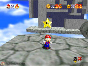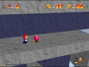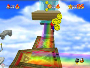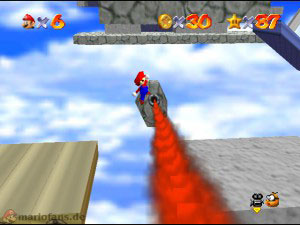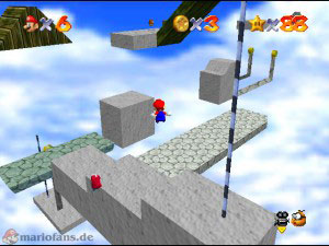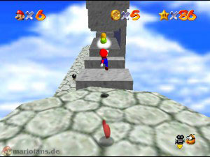 Diesmal musst du bei den drehen Plattformen nach geradeaus gehen zum Labyrinth, denn dort sind alle Münzen versteckt. Suche unten erstmal den blauen Schalter, aktiviere diesen und benutze dann den Wandsprung um dort nach ganz oben zu gelangen (Es ist nicht gerade leicht!). Oben angekommen sprich mit dem lilanen Bob-omb, der öffnet die Kanone die für später mal gut ist. Fahre jetzt wieder mit der hellblauen Plattform runter und hol dir auf dem Vorsprung die erste Münze (1). Ganz unten suchst du den blauen Stern, dort links ist die zweite rote Münze, die durch verschiedene Sprungtechnicken (Wandsprung, Hechtsprung, Dreifachsprung) erreicht werden kann (2). Auf der rechten Seite kletterst du danach holst und guckst einfach in alle Lücken, die Münzen sind nicht besonders schwer zu finden und ziemlich auf’m Haufen. Hast du alle acht eingesammelt, erscheint der Stern.