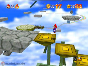 Wieder musst du zu den sich drehenden Plattformen, gehe diesmal links runter, dort wo eine Stange ist. Unten angekommen musst du nach rechts oben, dort auf die Schaukel und immer weiter nach oben. Zu den runterfallenden Plattformen, übers Feuer bis hin zur gelben Plattform. Jetzt musst du die Treppe hoch gehen und wieder die Schaukel benutzen, damit du zum Stern kommst.