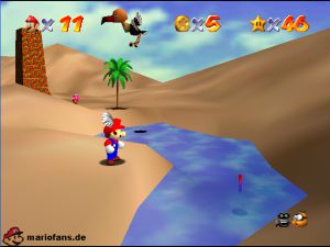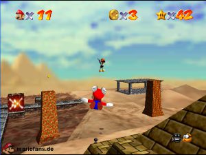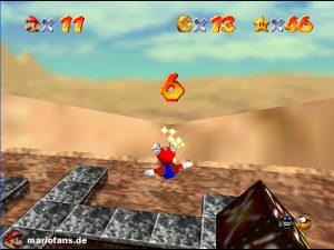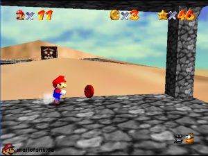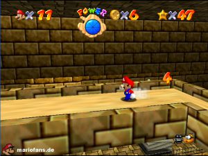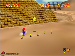 Sobald ihr durch die Wand gesprungen seit, müsst ihr geradeaus zum Pokey gehen. Wenn ihr diesen zerstört könnt ihr eine blaue Münze erhalten. Mithilfe des Shy Guys ist es möglich das Leben über dem Sandstrudel zu bekommen.* Geht nun zu dem kleinen Wüsten Labyrinth. Ihr müsst so gehen das ihr nicht platt gedrückt werdet, ein Treffer besiegt euch nicht sofort. Fallt nicht in den Treibsand, sonst müsst ihr das Level nochmal betreten. Der Ausgang befindet sich links! Habt ihr das Labyrinth durchquert, solltet ihr erstmal mit dem Bob-omb reden, dieser öffnet die Kanone. Dann geht auf den Turm, ja das funktioniert. Wenn der Geier über euch ist, müsst ihr nur noch gegen ihn springen. Den Stern könnt ihr zwischen den beiden Türmen abholen.