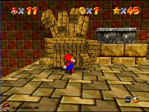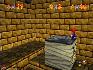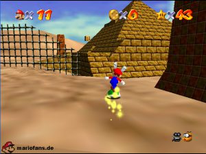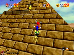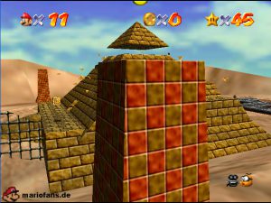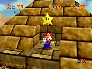 Begebt euch wieder zum Eingang der Pyramide. Diesmal geht hinein. Drin müsst ihr nach rechts gehen*. Folgt dem Weg, passt auf das ihr ab der einen Stelle nicht zerstampft werdet. Seid ihr eine Etage höher, müsst ihr wieder dem Weg folgen. Am Gitter müsst ihr euch die Münzen nicht holen, ihr fallt eher runter. Auch das Leben bekommt ihr nicht im Guten. Passt diesmal auf, das ihr nicht eingeklemmt werdet. Wenn ihr die Stange hochklettert, könnt ihr in der Ecke einen Teleporter finden, welcher euch zum 1-Up Pilz bringt, aber nicht mehr zurück. Wieder in der 2. Etage, müsst ihr euch an das Gitter hängen und euch rüber hangeln. Oder ihr nehmt mit einem Hechtsprung (laufen+Z+A) eine kleine Abkürzung und lauft dann auf dem Sandstrom entlang. In der 3, Etage müsst ihr aufpassen, das ihr nicht platt gewalzt werdet. Entweder Ihr überspringt die Rolle oder ihr versteckt euch im Loch, was dafür vorgesehen ist. Habt ihr ein wenig Schaden erlitten, könnt ihr euch nun am Herz aufladen. Wenn ihr das Treppenspiel überwunden habt, müsst ihr den Weg entlang laufen und dann Vorsichtig euch an der Wand vorbei tasten. Passt auf das euch nicht die Elektronen treffen! In der 5. Etage könnt ihr entweder den „Stampfo“ überspringen oder durchlaufen wenn er in der Luft ist. Vorsicht Absturz Gefahr! Die Münzen zeigen euch dann den Weg zum Stern.