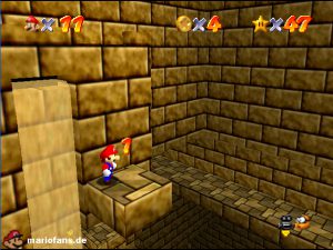 Für diese Mission müsst ihr wieder in die Pyramide. Es empfiehlt sich durch das Dach einzusteigen. Ihr müsst also vorher einmal auf allen Säulen landen. Sobald ihr im Käfig seid, müsst ihr schnell reagieren. Springt sofort raus in Richtung Stern. Versucht am besten bei den Münzen zu landen. Ihr seht eine kleine Lücke in der „Mauer“. Klettert dort vorsichtig runter. Ihr landet auf einem Vorsprung mit einer Münze (1). Nun müsst ihr vorsichtig nach links springen. Etwas tiefer ist eine weitere Plattform mit einer Münze (2). Springt nun wieder ein Stückchen nach rechts (3). Habt ihr die drei Münzen, springt nach links unten, so das ihr im Sandbecken landet, wo auch der Sandfall weiter geht. Passt auf das ihr nicht untergeht. Springt (A) immer wieder hoch. In der einen Ecke wartet eine Münze (4) und in der nächsten auch (5). Habt ihr dann alle fünf Münzen eingesammelt erscheint der Stern am Ende des Sandfalls. Entweder ihr springt an der Stelle hoch wo der Stern ist, oder ihr klettert bei Münze fünf raus und hangelt euch zu der Stelle und springt dann auf den Stern.