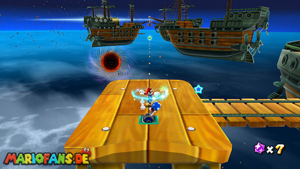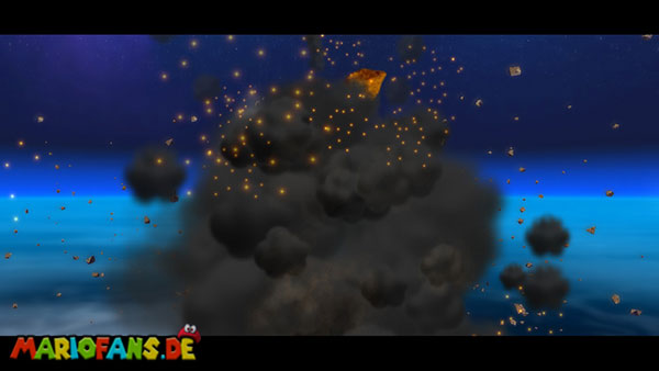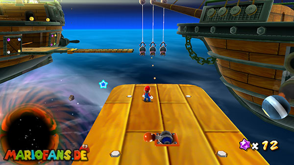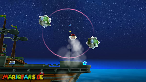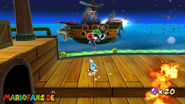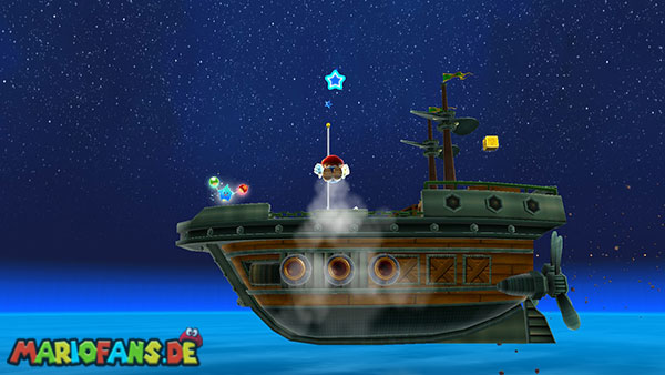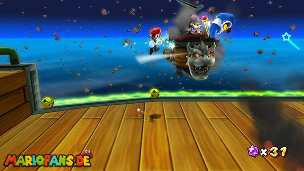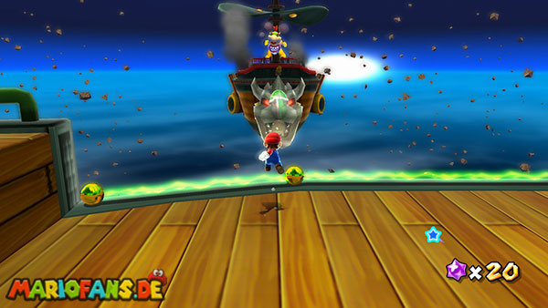 ScreenshotAuf der nun folgenden wilden Fahrt weicht ihr den Kanonenkugeln aus, und vermeidet die Gegner, bis ihr vorne angelangt seid. Lauft den Steg entlang und erledigt die Hexe, weiter geht es über den Sternenring nach oben. Euch erwartet wiederum eine Begegnung mit Bowser Jr. Euer Ziel ist es das Schiff auf dem er sich befindet zu attackieren. Springt dazu den Schildkröten die sich hier bewegen auf den Kopf, und schnappt euch den Panzer. Damit lauft ihr nach oben und schießt auf das Schiff. Zwischendurch solltet ihr in Bewegung bleiben, und den Kanonenkugeln sowie den Zielverfolgungs-Geschossen ausweichen, auch einige Hexen können später auftauchen. Nachdem ihr das Schiff oft genug getroffen habt greift euch dieses mit der Vorderseite an. Weicht auch jetzt den brennenden Kugeln aus, und attackiert das Schiff weiterhin mit grünen Panzern, bis es zerstört ist.