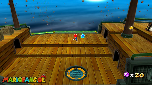 Auf dem ersten Schiff lauft ihr nach vorne und erledigt alle Gegner. Rechts zerstört ihr den Kristall um einige kleinere Sterne zu bekommen, links hingegen springt ihr in das Loch. Zielt mit der Kanone auf die Fahnenstange, und zielt auf die gelbe Spitze von dieser. Wartet nun noch am besten bis sich die explosiven Kugeln seitlich neben der Stange befinden, bevor ihr die Kanone abfeuert. Solltet ihr dennoch an der Stange vorbeifliegen müsst ihr schnell den blauen Stern anvisieren, bevor ihr euch zu weit entfernt. Rutscht an der Stange nach unten und lauft schnellstens zu der Vorderseite des Schiffes, die Hexe könnt ihr im vorbeilaufen besiegen, wichtig ist das ihr schnellstens die nächste Kanone erreicht. Weiter geht es über die nächste Fahnenstange, auch hier könnt ihr euch über einen blauen Stern retten. Rutscht nach unten und erledigt zunächst alle Gegner, links kauft ihr bei dem Vielfraß einen roten Pilz um eure Lebensenergie zu vergrößern. Lauft über die Brücke weiter, achtet aber auf den Stinkkäfer, weiter vorne aktiviert ihr schließlich den Schalter.