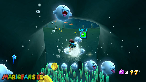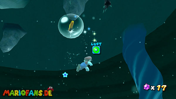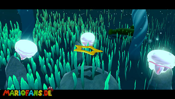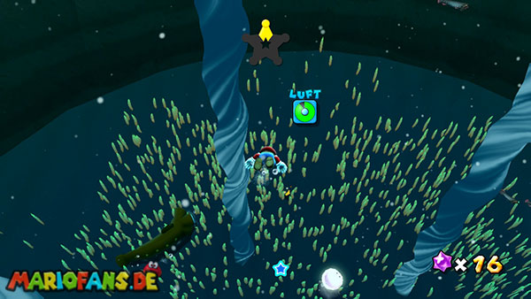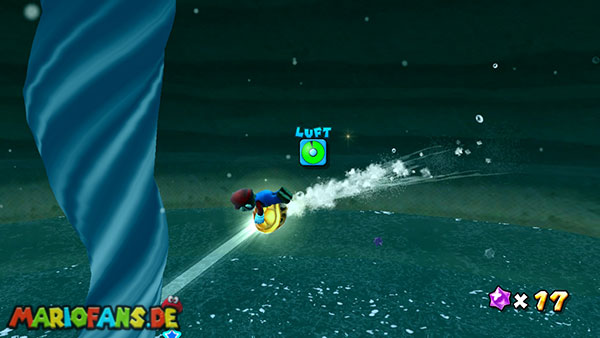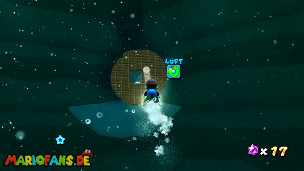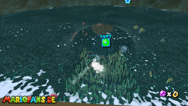 Lauft nach links ins Wasser, und taucht durch die Höhle, ihr solltet beim unterirdischen Durchgang möglichst viele der Blöcke zerstören, damit sie euch später nicht im Weg sind. Auf der anderen Seite taucht ihr zunächst auf um Luft zu holen, weiter geht es jedoch unter Wasser. In der Mitte des Bereiches befindet sich der erste Teil des Sternenringes, im umliegenden Gebiet, zwischen den grünen Pflanzen, liegen die restlichen Teile. Achtet am besten auf das glitzern der Sternenteile, damit ihr sie schneller findet. Weiter geht es über den Sternenring nach oben, wo ihr bereits den goldenen Panzer findet. Schnappt ihn euch und kehrt nach unten zurück, und über den Durchgang zum Anfang. Hier werft ihr den Panzer gegen die goldene Truhe um einen Stern zu bekommen.