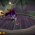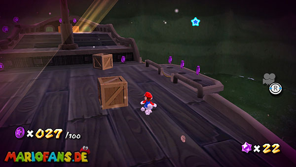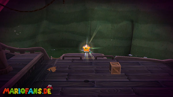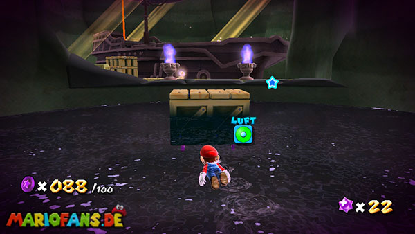 Starte dazu den 2. Stern noch mal und tauche noch mal in dem Becken, bei dem man zuvor zum Geisterschiff gelangte, auf den Grund und bringe die Wasserminen, die kreisförmig um ein Bootswrack angeordnet sind, zur Detonation und fliege mithilfe des erscheinenden Reise-Sternes zum riesigen ?-Block. Hier musst du es wiederholt schaffen den Pfeilschalter zu aktivieren, bis du einen Lichtstrahl freilegen kannst und somit Buu Huu verschwinden zu lassen.