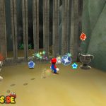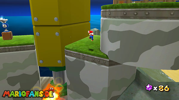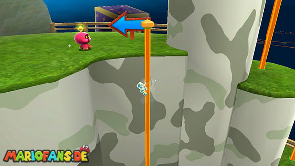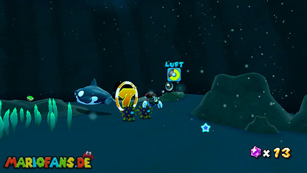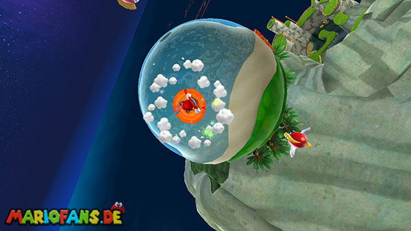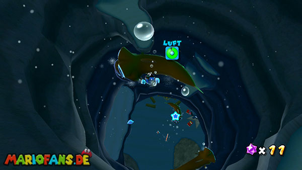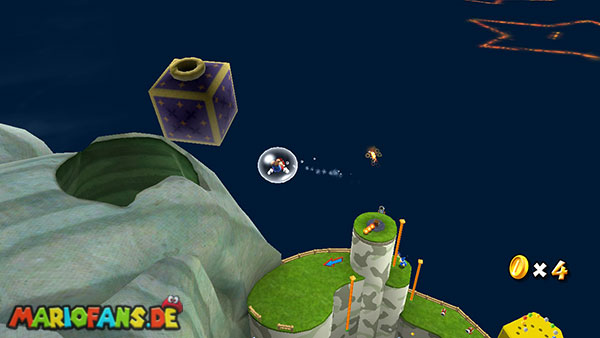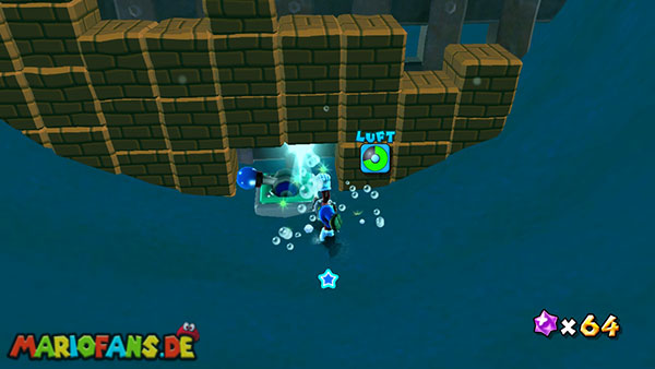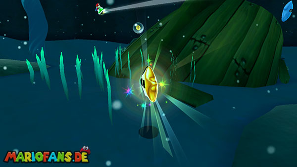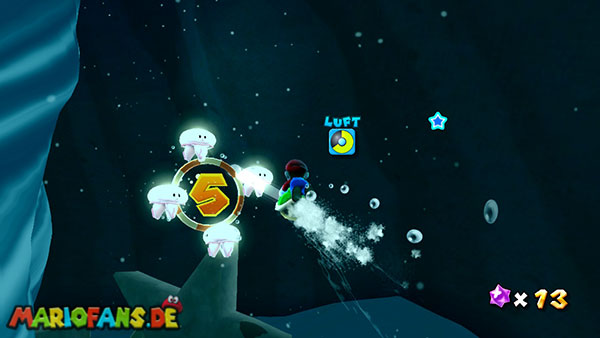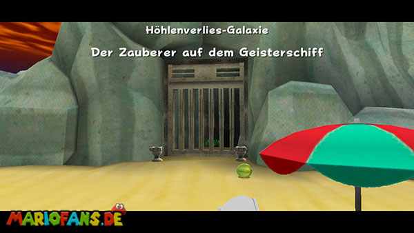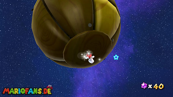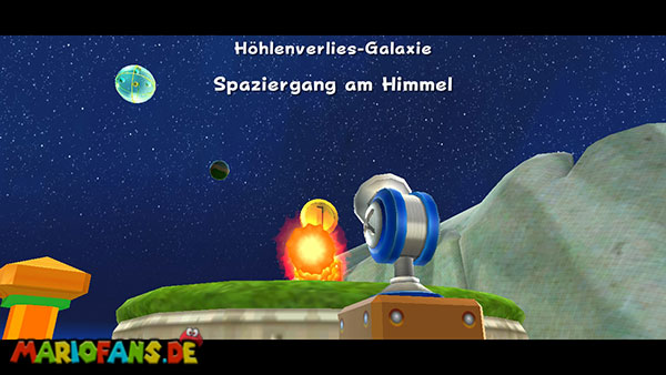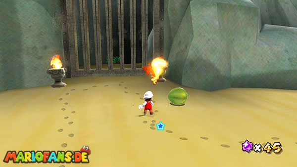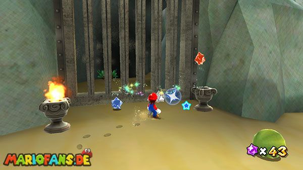Auf dem Strand lauft ihr zu dem grünen Pilzkopf, und springt in das Loch das sich neben ihm befindet. Zielt mit der Kanone auf den Planeten, jedoch so dass ihr am Weg auch noch den Unverwundbarkeitsstern einsammelt. (Ihr müsst dazu ein Stück über den Stern zielen) Auf dem Planeten angekommen erledigt ihr am besten zunächst alle Gegner, bevor sie euch irgendwelche Probleme bereiten. Auf der Unterseite des Planeten könnt ihr schließlich die Feuerblume einsammeln. Lauft schnell nach oben und benutzt den Sternenring um zum Strand zurückzukehren. Hier müsst ihr geradeaus zu dem Gitter, und die Fackeln links sowie rechts vom Gitter entzünden. In der Höhle müsst ihr ins Wasser springen und bist fast ganz nach unten tauchen. Jedoch noch kurz zuvor führt eine Abzweigung weg. Aktiviert den Schalter um weiterzukommen, auch das nächste Gitter öffnet sich durch einen Schalter unter diesem. (Achtung, während der ganzen Unterwasser-Aktion solltet ihr zwischendurch Luftblasen einsammeln, damit euch der Sauerstoff nicht ausgeht)