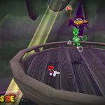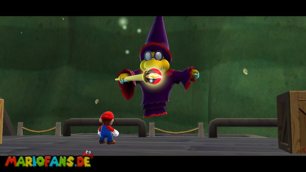 Wieder an Land lauft ihr zu dem Schiff weiter. Euch erwartet ein etwas größerer Zauberer. Weicht zunächst seinen Angriffen aus, und wartet bis ein grün gefärbter Zauberspruch auf euch zugeflogen kommt. Dieser verwandelt sich in einen grünen Panzer. Sammelt diesen ein, wenn ihr sich noch bewegen sollte am besten mittels Drehattacke. Nun solltet ihr warten bis der Zauberer irgendwo auftaucht, und genau zielen bevor ihr ihn mit dem Panzer abschießt. Ihr benötigt durchaus einige Treffer bis sich der Kampf nach oben verlagert. Auch dort müsst ihr den Zauberer mit grünen Panzern abschießen, achtet aber zusätzlich auf kleinere Hexen, die er zwischendurch zur Unterstützung herbeiruft.