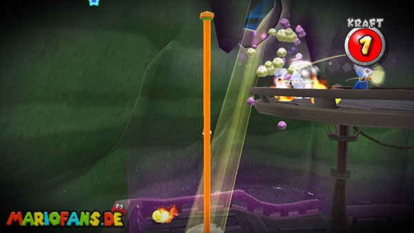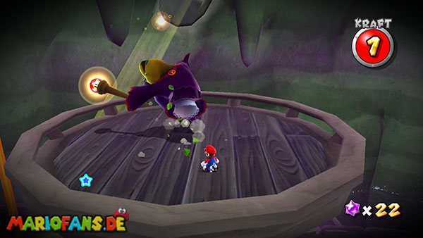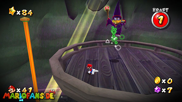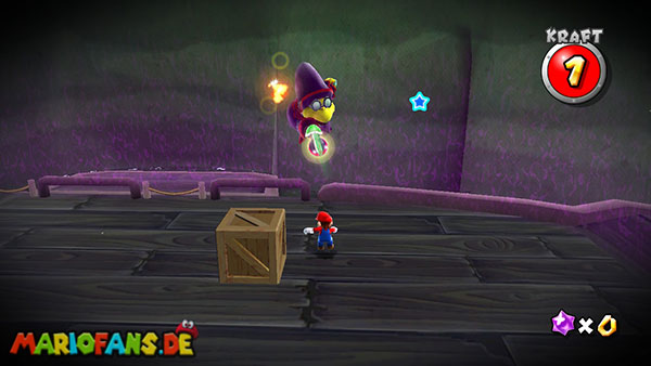 Du musst erneut zum Bosskampf antreten. Diesmal hast du aber nur ein Leben. Besiege Kamek für den Power-Stern.