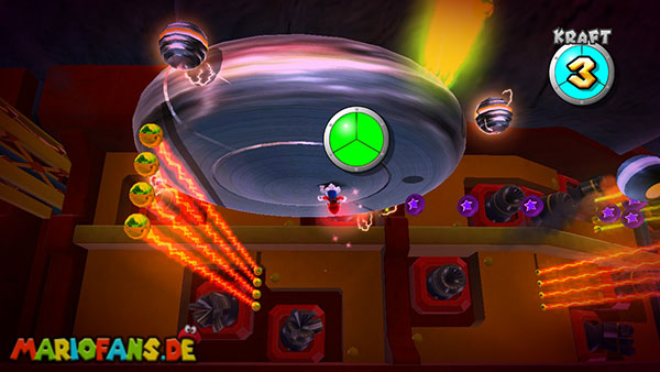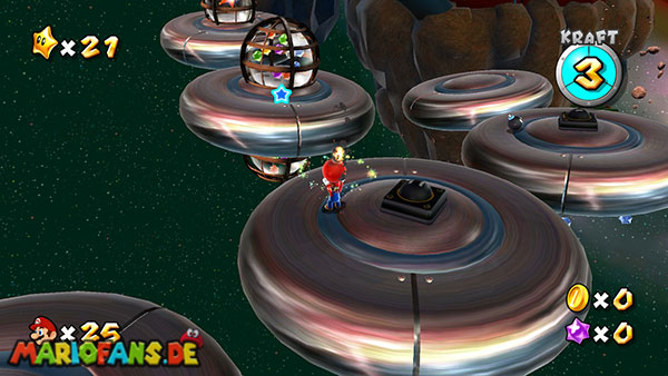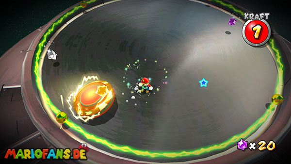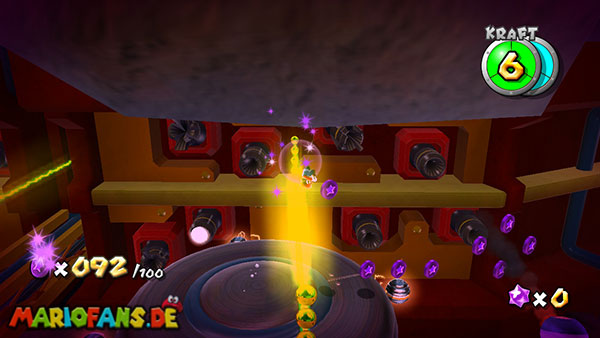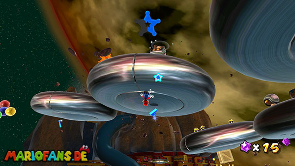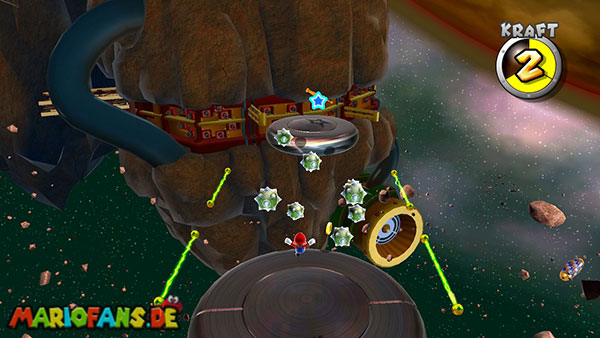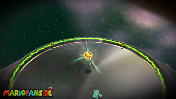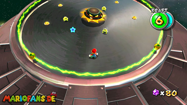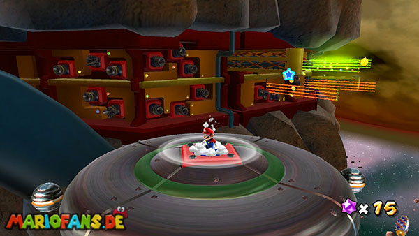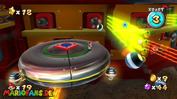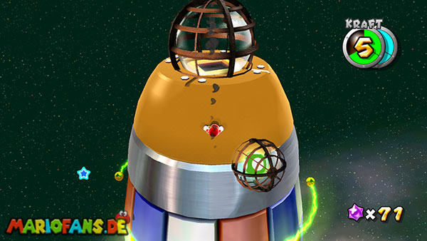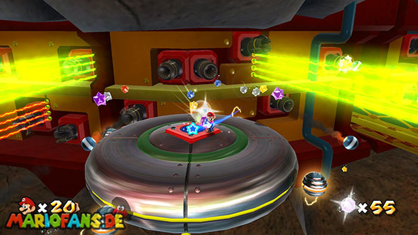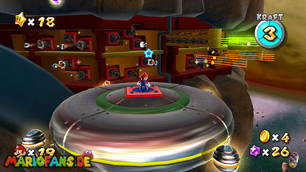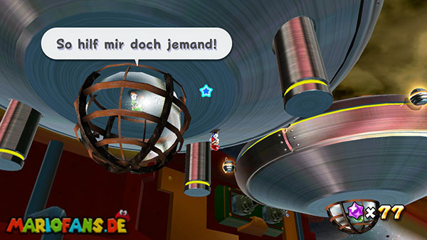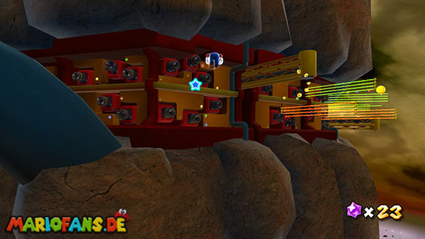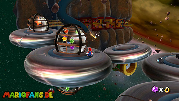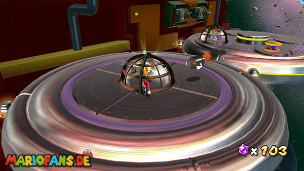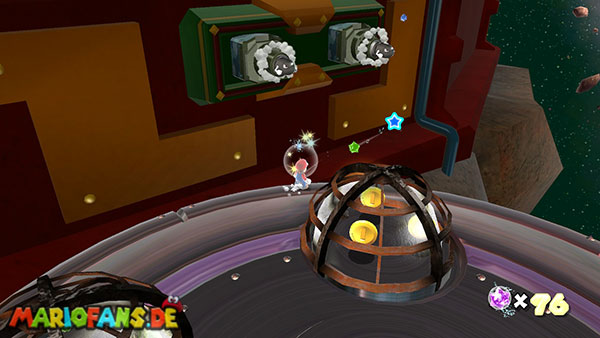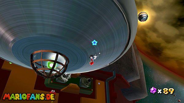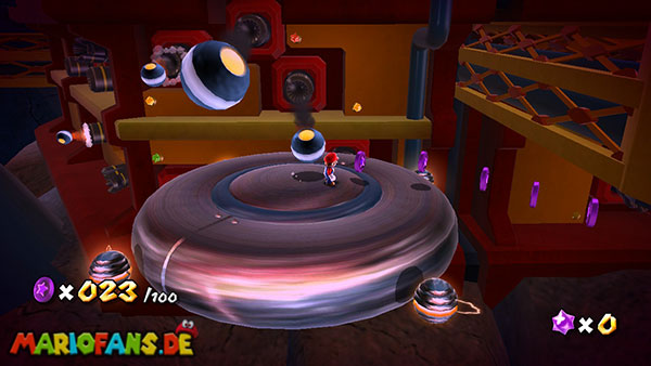 Auf den ersten metallischen Objekten müsst ihr zunächst die fünf blauen Sternteile finden. Manche von diesen sind in Bewegung, andere befinden sich auf der Unterseite der Scheiben. Achtet außerdem auf einige Gegner die sich hier ebenfalls herumtreiben. Sobald die blauen Sterne aufgetaucht sind benutzt ihr diese um nach oben zum Sternenring zu kommen. Dieser wiederum bringt euch weiter. Lauft auf der Plattform nach oben, und immer nach oben weiter bis ihr schließlich einen Schalter aktivieren sollt. Stellt euch dazu auf den Schalter, und dreht die Fernbedienung. Nun bewegt sich die Plattform zunächst nach vorne, und hier schließlich nach rechts. Passt auf die unzähligen Kanonenkugeln auf, bei dem Objekt müsst ihr euch ducken damit ihr es auf die andere Seite schafft. Am Rest des Weges könnt ihr entweder den hohen Sprung verwenden, (haltet dazu wenn ihr steht zunächst die Z-Taste gedrückt, und springt dann erst weg) oder ihr lauft zur unteren Seite der Plattform. (Passt jedoch hierbei auf die Elektroschocker am Rand auf)
