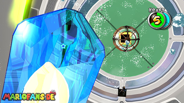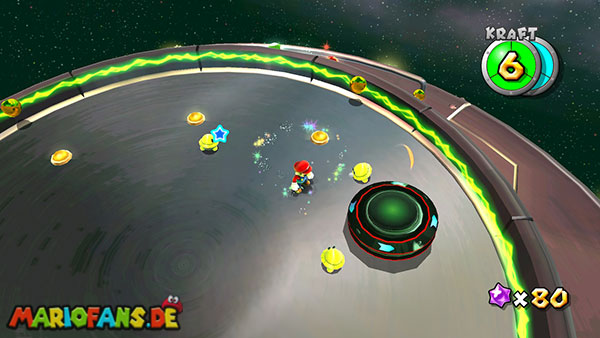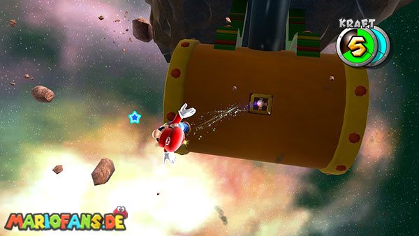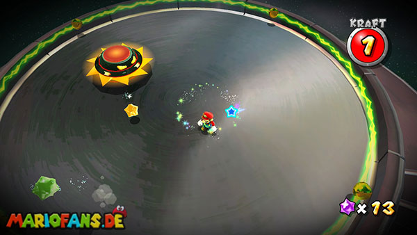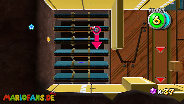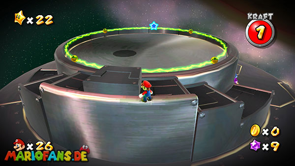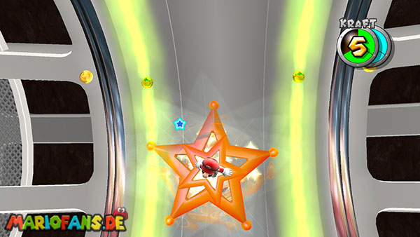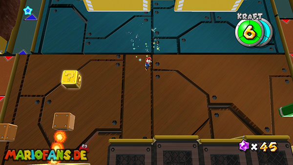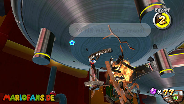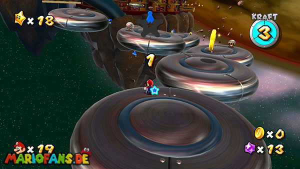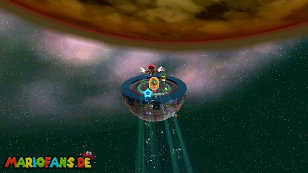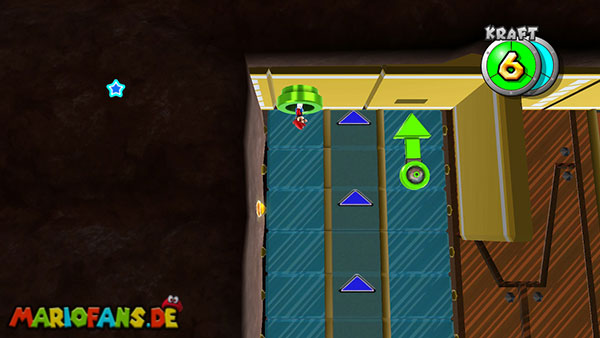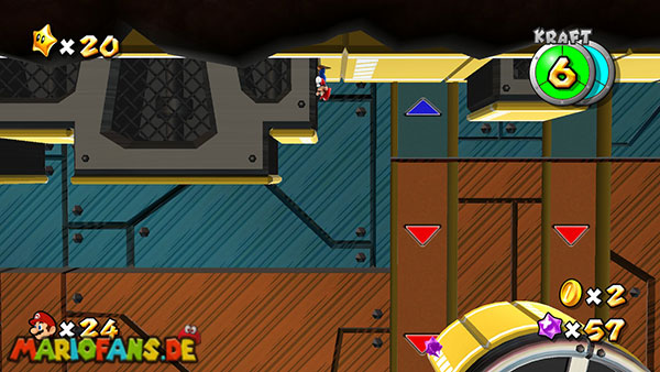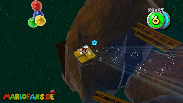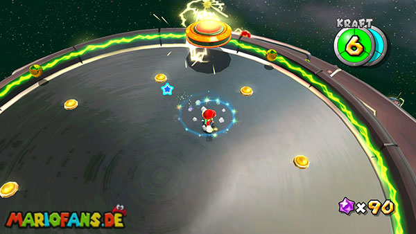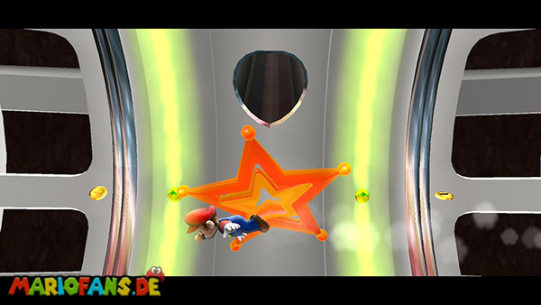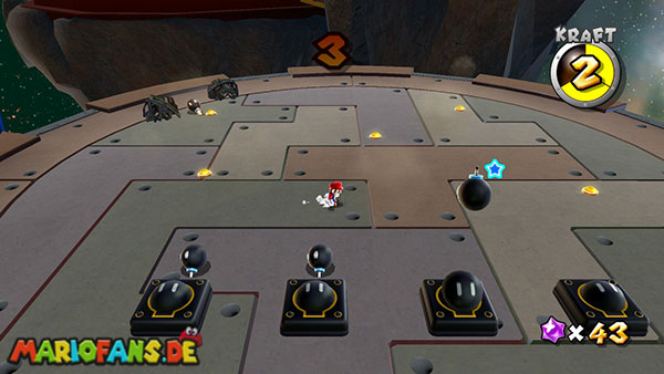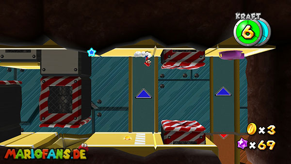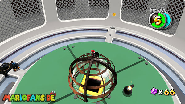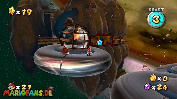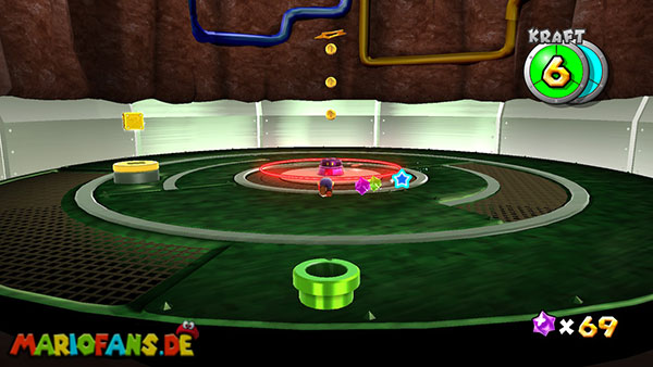 Auf den ersten metallischen Objekten müsst ihr zunächst die fünf blauen Sternteile finden. Manche von diesen sind in Bewegung, andere befinden sich auf der Unterseite der Scheiben. Achtet außerdem auf einige Gegner die sich hier ebenfalls herumtreiben. Sobald die blauen Sterne aufgetaucht sind benutzt ihr diese um nach oben zum Sternenring zu kommen. Dieser wiederum bringt euch weiter. Lauft auf der Plattform nach oben, und immer nach oben weiter bis ihr schließlich einen Schalter aktivieren sollt. Stellt euch dazu auf den Schalter, und dreht die Fernbedienung. Nun bewegt sich die Plattform zunächst nach vorne, und hier schließlich nach rechts. Passt auf die unzähligen Kanonenkugeln auf, bei dem Objekt müsst ihr euch ducken damit ihr es auf die andere Seite schafft. Am Rest des Weges könnt ihr entweder den hohen Sprung verwenden, (haltet dazu wenn ihr steht zunächst die Z-Taste gedrückt, und springt dann erst weg) oder ihr lauft zur unteren Seite der Plattform. (Passt jedoch hierbei auf die Elektroschocker am Rand auf)