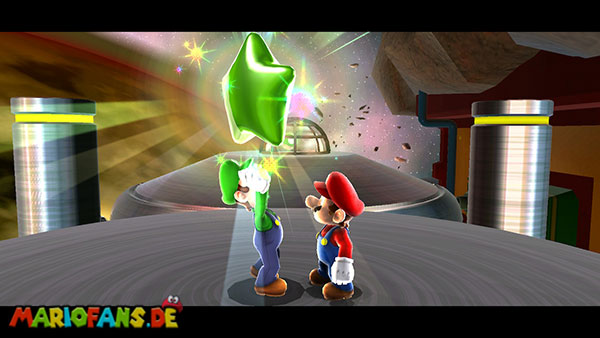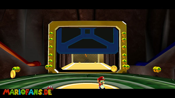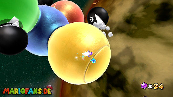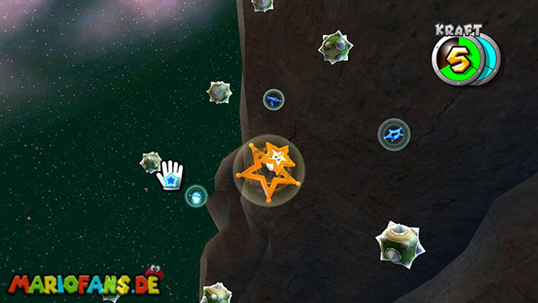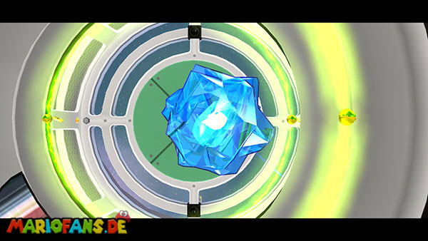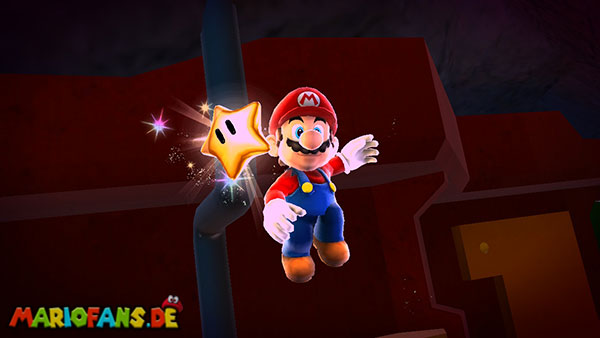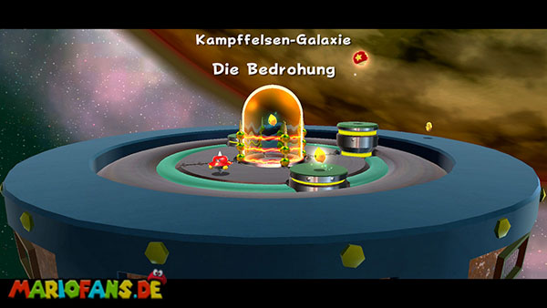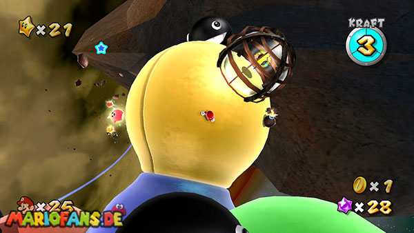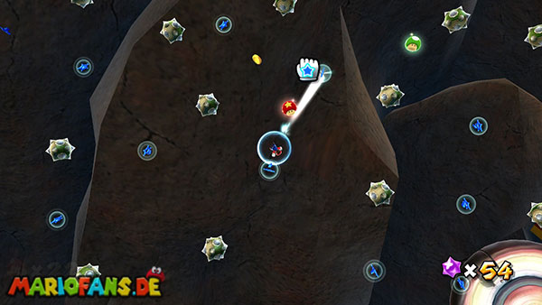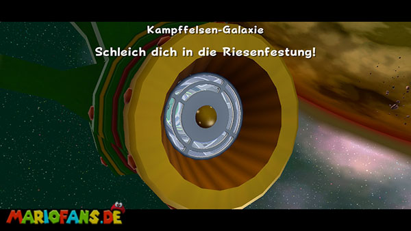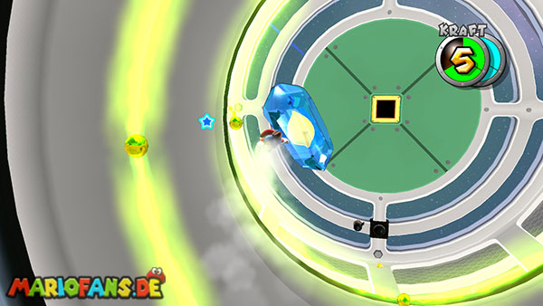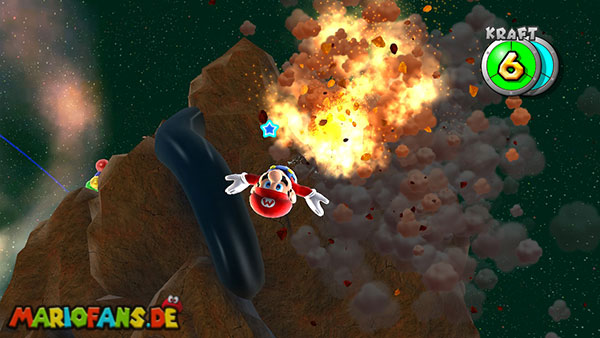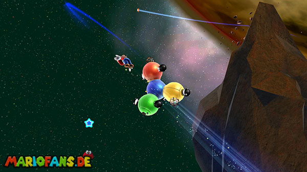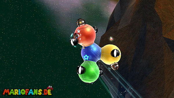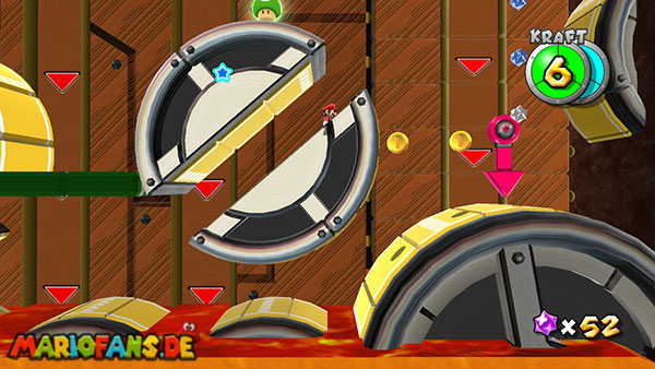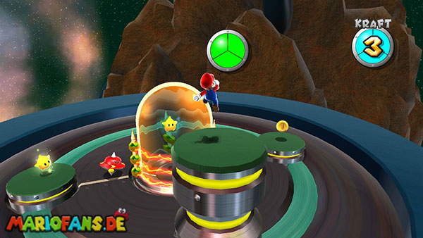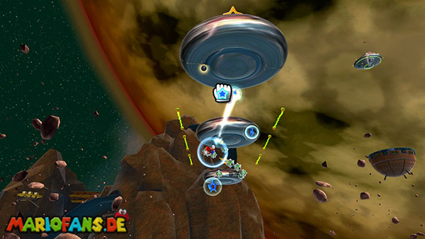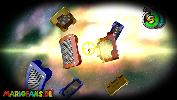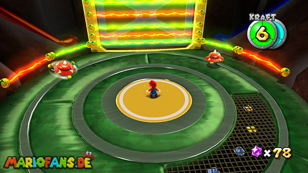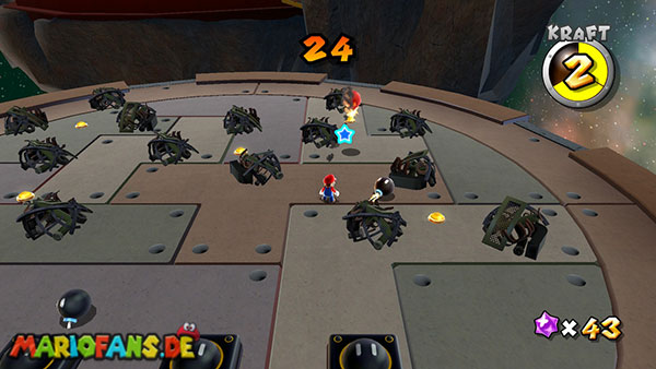 Auf den ersten metallischen Objekten müsst ihr zunächst die fünf blauen Sternteile finden. Manche von diesen sind in Bewegung, andere befinden sich auf der Unterseite der Scheiben. Achtet außerdem auf einige Gegner die sich hier ebenfalls herumtreiben. Sobald die blauen Sterne aufgetaucht sind benutzt ihr diese um nach oben zum Sternenring zu kommen. Dieser wiederum bringt euch weiter. Lauft auf der Plattform nach oben, und immer nach oben weiter bis ihr schließlich einen Schalter aktivieren sollt. Stellt euch dazu auf den Schalter, und dreht die Fernbedienung. Nun bewegt sich die Plattform zunächst nach vorne, und hier schließlich nach rechts. Passt auf die unzähligen Kanonenkugeln auf, bei dem Objekt müsst ihr euch ducken damit ihr es auf die andere Seite schafft. Am Rest des Weges könnt ihr entweder den hohen Sprung verwenden, (haltet dazu wenn ihr steht zunächst die Z-Taste gedrückt, und springt dann erst weg) oder ihr lauft zur unteren Seite der Plattform. (Passt jedoch hierbei auf die Elektroschocker am Rand auf)