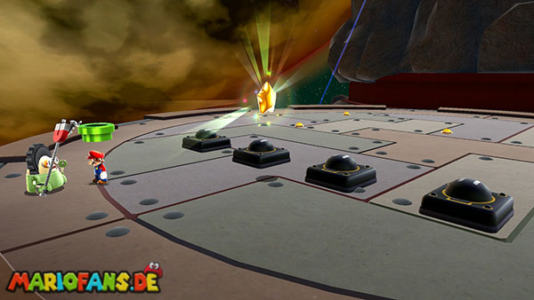 Lauft ein Stück nach rechts und aktiviert den Pfeil indem ihr die Fernbedienung schütteln. Nun lauft ihr den ganzen Weg nach rechts, achtet aber auf die Flammen die sich bewegen, auch bei den Plattformen wartet ihr am besten bis sich ein für euch günstiger Weg gebildet hat. Ganz rechts angelangt aktiviert ihr erneut einen Schalter, und gelangt somit an die Decke. Lauft nach rechts und lasst euch zu dem Gegner nach oben fallen, diesen müsst ihr nun ausschalten. Lauft ein Stück nach links zurück, und wartet bis die Plattformen eingefahren sind, dann lauft ihr schnell weiter. Am Ende gelangt ihr eine Ebene nach oben, hier müsst ihr euch rechts halten. Achtet aber auf die rot-weiß markierten Plattformen, diese können euch zerquetschen wenn ihr nicht schnell genug weiterläuft. Am anderen Ende gelangt ihr über eine Sprungfeder nach unten, zu einer Warp-Röhre.