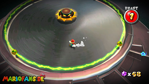 Springt über die roten Energiewellen des Gegners, und springt ihm schließlich auf den Kopf, somit werdet ihr nach oben zu dem Sternenring befördert. Im nun folgenden Raum müsst ihr die Kreisel wiederum in die Elektrobarrieren befördern um den Weg freizumachen. Auf der Unterseite der Untertasse angekommen lauft ihr vorsichtig nach oben, und erklimmt den höchsten Punkt. Hier erwartet euch wiederum ein Zwischengegner. Springt zunächst auf die Mitte des Kreisels, dann färbt sich dieses grün, und ihr könnt ihn mit einer Drehattacke angreifen, euer Ziel ist es den Kreisel in eine der Elektrobarriere zu werfen. Das ganze müsst ihr insgesamt drei Mal schaffen um den Kampf zu gewinnen. Zwischendurch ruft der Gegner Verstärkung, seid also vorsichtig und erledigt diese, bevor ihr euch wieder dem Hauptgegner widmet.