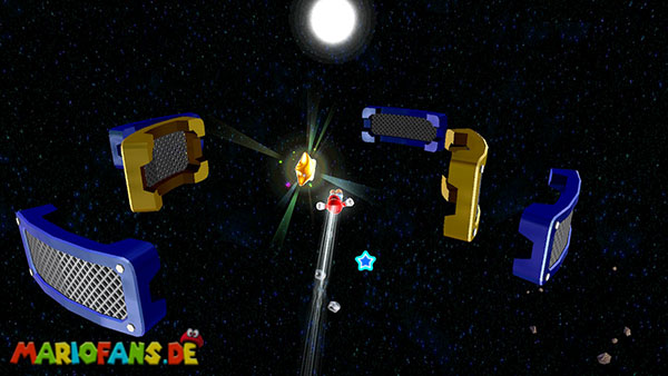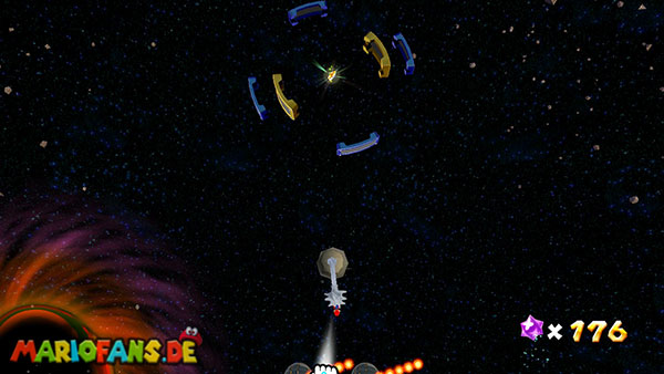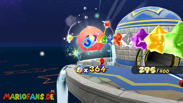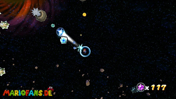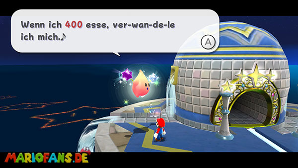 Außerhalb des Badezimmers befindet sich ebenfalls ein Vielfraß. Gebt ihm 400 Sternenteile und er verwandelt sich in eine neue Galaxie. Diese erreicht ihr durch den Sternenring der nun anstelle des Vielfraßes aufgetaucht ist.