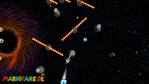 ScreenshotBenutzt die Kokons damit ihr euch zwischen diesen hin und her schießt. Achtet auf die Kanonenkugeln am Weg, sie dürfen euch natürlich nicht erwischen. Dort wo sich ein Pfeil befindet müsst ihr besonders vorsichtig sein. Wartet hier etwas länger, bis weniger Kugeln durch die Gegend fliegen, bevor ihr weitermacht. Bei dem nun folgenden Gebiet bewegt ihr euch von einem blauen Stern zum nächsten. Beachtet das ihr die explosiven Kugeln die sich hier befinden mit Sternen abschießen könnt, somit erspart ihr euch möglicherweise einiges an Lebensenergie. Auch bei den nun folgenden Kokons müsst ihr vorsichtig sein, wartet immer bis sich die Flammen wegbewegt haben. Verzichtet außerdem besser auf das Extra-Leben, da es von dort aus schwieriger ist wegzukommen. Am Ende müsst ihr warten bis sich die vier Flammenfallen zur Seite bewegen, der Stern ist jedoch ebenfalls gesichert. Erst wenn der Weg frei ist, also keine Plattform auf eurer Strecke ist, solltet ihr euch nach oben katapultieren.
