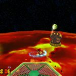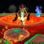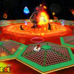 Folgt dem Pfad auf dem ersten Planeten, und erledigt am Weg alle Gumbas, damit sie euch später nicht in die Quere kommen. Am Ende kommt ihr zu einer großen Kanone. Lasst euch von einem Geschoss verfolgen, und lauft wieder den ganzen Weg zurück zum Startpunkt. Das Geschoss muss nun in den Käfig detonieren um einen Sternenring freizulegen. Dieser bringt euch weiter nach unten auf den Planeten. Haltet euch eher links, und sammelt den roten Pilz ein, weiter geht es nach vorne. Am Ende müsst ihr die beiden Gegner besiegen indem ihr die grüne Kugel zu ihnen zurückschleudert, das erledigt ihr mit der Drehattacke. Sind beide besiegt taucht ein weiterer Sternenring auf. Passt bei der ganzen Aktion vor allem auf nicht mit der Plattform in der Lava zu versinken, bleibt also eher in Bewegung.