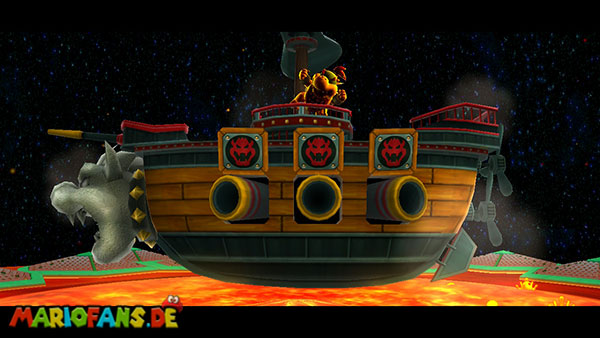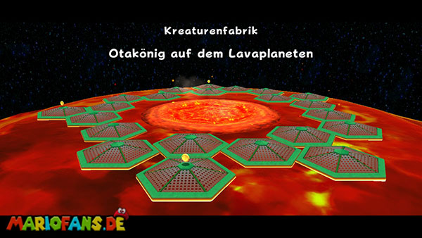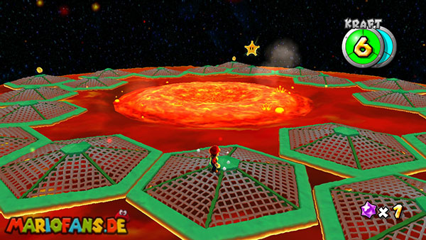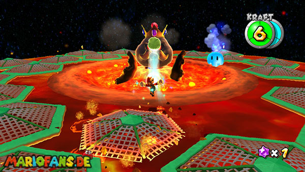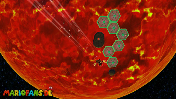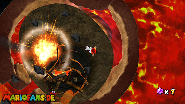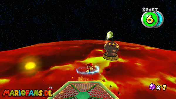 Folgt dem Pfad auf dem ersten Planeten, und erledigt am Weg alle Gumbas, damit sie euch später nicht in die Quere kommen. Am Ende kommt ihr zu einer großen Kanone. Lasst euch von einem Geschoss verfolgen, und lauft wieder den ganzen Weg zurück zum Startpunkt. Das Geschoss muss nun in den Käfig detonieren um einen Sternenring freizulegen. Dieser bringt euch weiter nach unten auf den Planeten. Haltet euch eher links, und sammelt den roten Pilz ein, weiter geht es nach vorne. Am Ende müsst ihr die beiden Gegner besiegen indem ihr die grüne Kugel zu ihnen zurückschleudert, das erledigt ihr mit der Drehattacke. Sind beide besiegt taucht ein weiterer Sternenring auf. Passt bei der ganzen Aktion vor allem auf nicht mit der Plattform in der Lava zu versinken, bleibt also eher in Bewegung.