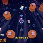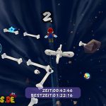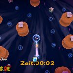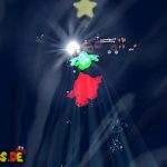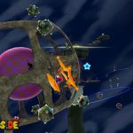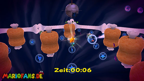 Kümmert euch um die schwarzen Geister, mit ihnen könnt ihr die beiden Statuen zerstören. Über den Kokon gelangt ihr nach oben weiter, ihr müsst wieder einmal die blauen Sternteile einsammeln. Schleudert euch dazu von einem Kokon zum nächsten, passt jedoch auf das ihr euch nicht ins Weltall befördert. Am Ende tauchen so links oben blaue Sterne auf, diese benutzt ihr um den nächsten Sternenring zu erreichen. Nachdem ihr das Extra-Leben im Inneren des kleinen Planeten eingesammelt habt springt ihr nach draußen. Achtet nun genau auf die Bomben die sich hier bewegen, ihr könnt sie im Zweifelsfall auch mit Sternen abschießen, damit sie euch nicht in die Quere kommen. Am nächsten Ort angekommen könnt ihr euch bei dem Stern eine Lebensenergie-Erweiterung kaufen, weiter geht es nach unten.