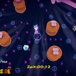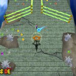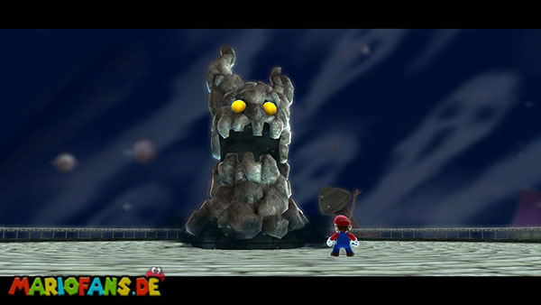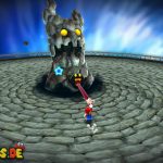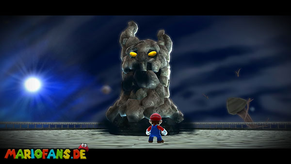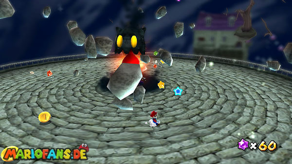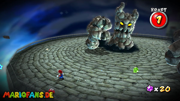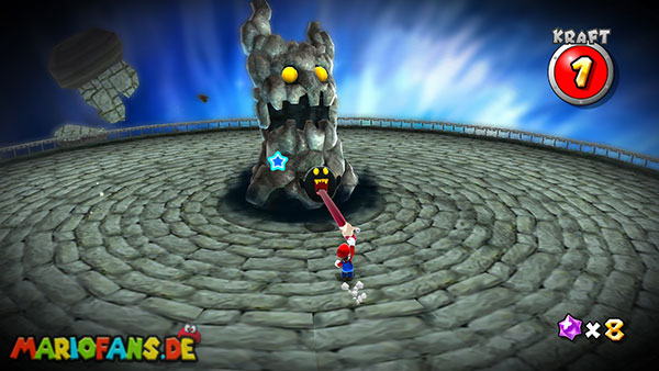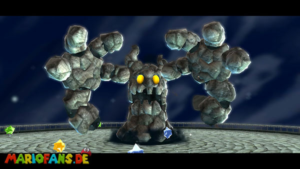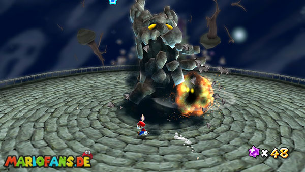 Bleibt in Bewegung, und weicht den Attacken des Gegners aus. Sobald er mit Gesteinsbrocken auf euch schießt sind manchmal auch schwarze Brocken dabei, diese sind schwarze Geister. Benutzt die Geister um sie gegen den Gegner zu stoßen, das müsst ihr insgesamt drei Mal schaffen. Nun springt der Gegner durch die Gegend, ihr müsst den roten Teil von ihm erneut mit einem schwarzen Geist treffen, um einen Treffer zu landen. Nun wiederholt sich das ganze noch einmal, dummerweise hat der Gegner aber zwei Hände bekommen. Versucht am besten so gut es geht den Kopf des Feindes zu treffen, die Hände wachsen dummerweise nach kurzer Zeit ohnehin wieder nach. (Am besten ihr zerstört eine der beiden Hände, und versucht dann von dieser Seite den schwarzen Geist auf den Kopf zu schleudern, somit landet ihr leichter einen Treffer ohne dass euch die Hände im Weg sind) Wichtig ist das ihr bei diesem Kampf die ganze Zeit in Bewegung bleibt, und die schwarzen Geister erst dann einsetzt wenn euch der Gegner gerade nicht attackiert. Achtet außerdem auf gelbe Gesteinsbrocken, diese enthalten Münzen, und stellen somit eure Lebensenergie wieder her. Die Gesteinsbrocken die auf euch zufliegen könnt ihr außerdem mit kleinen Sternen abschießen. Um den Felsen die aus dem Boden wachsen am besten auszuweichen lauft ihr ganz außen, hier könnt ihr meistens entkommen, da ihr oft zwischen zwei Felsfronten gefangen seid.