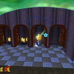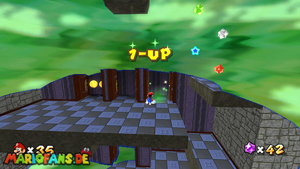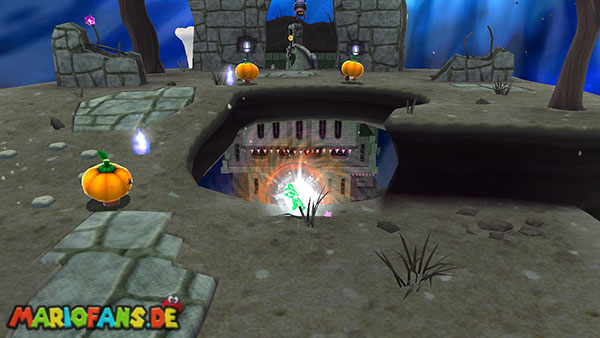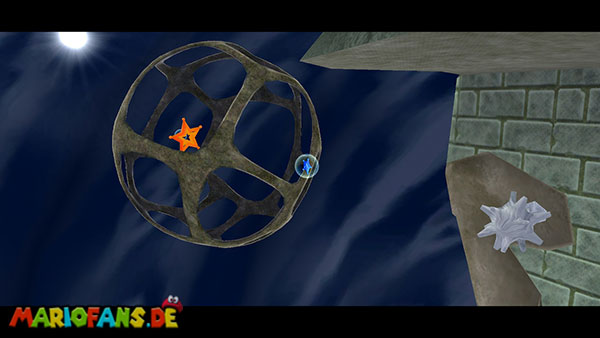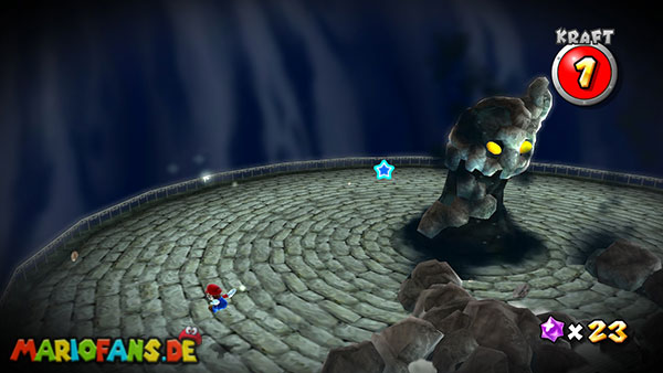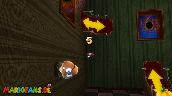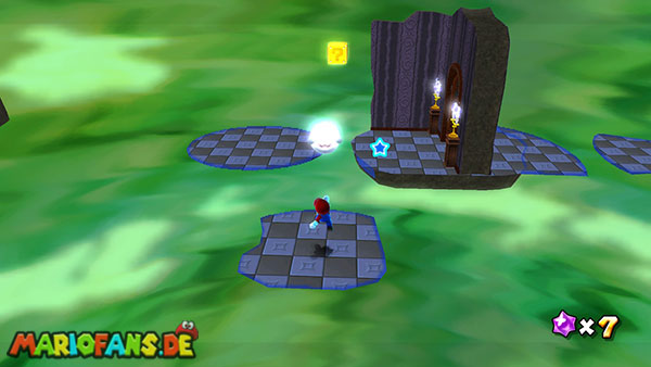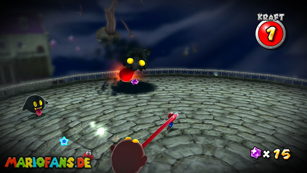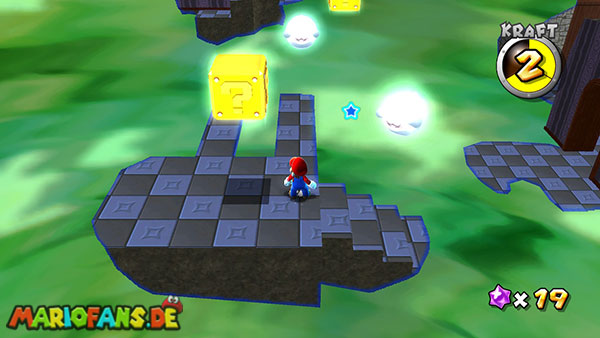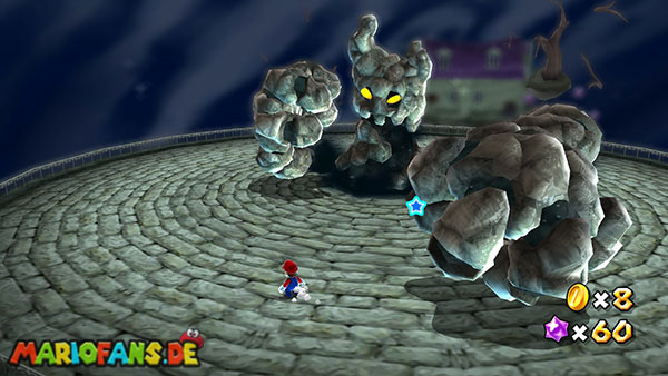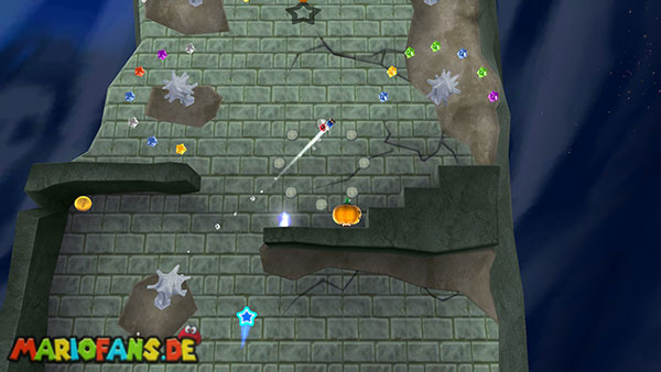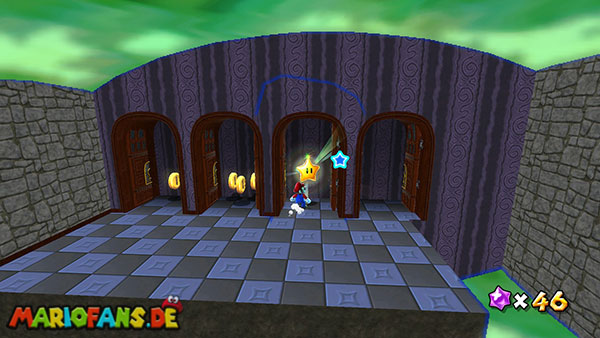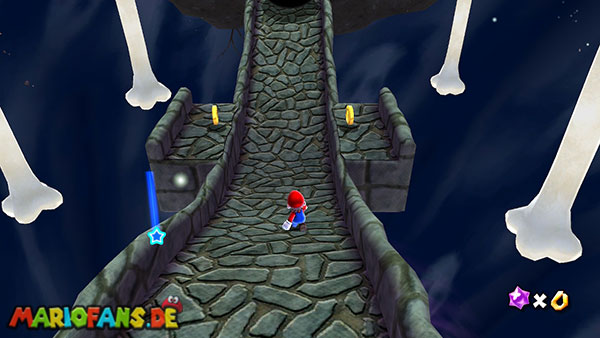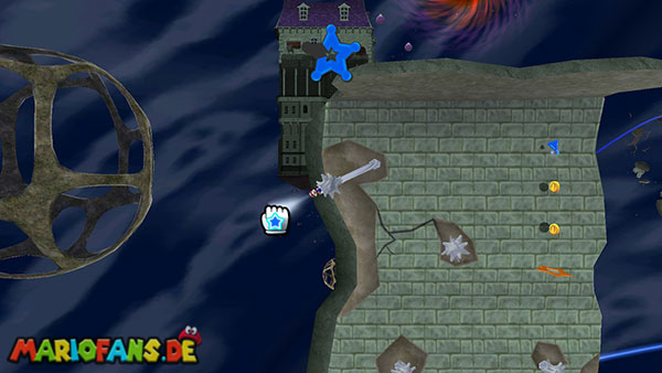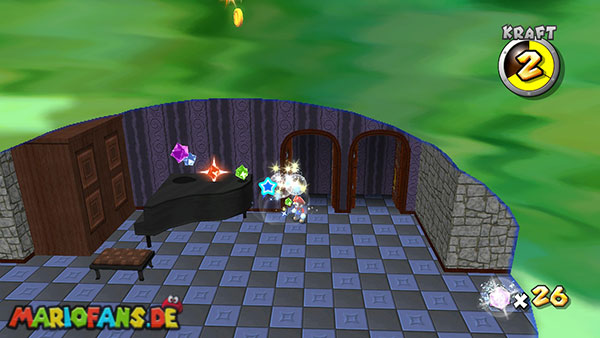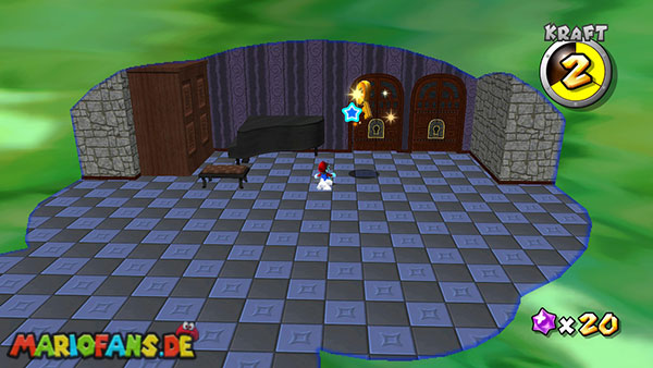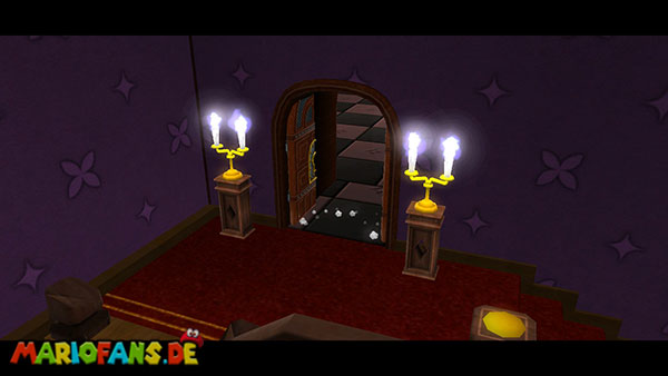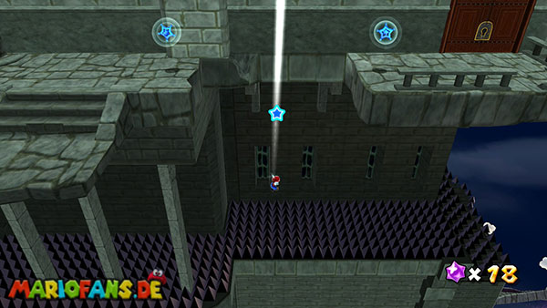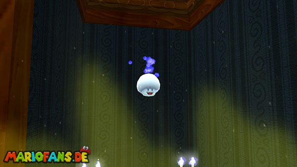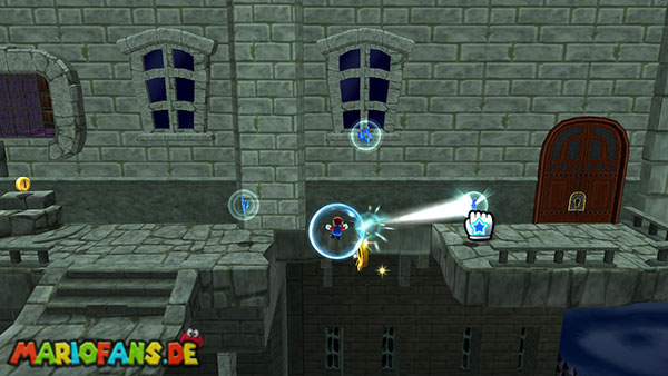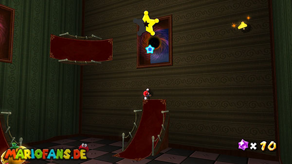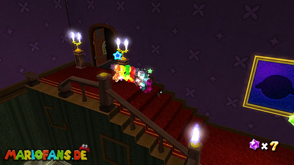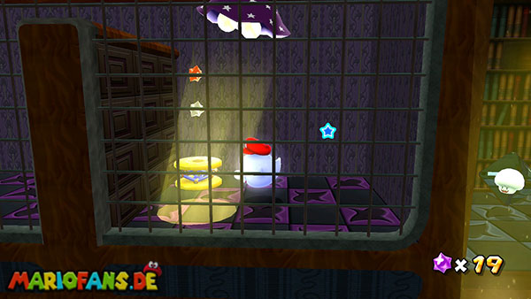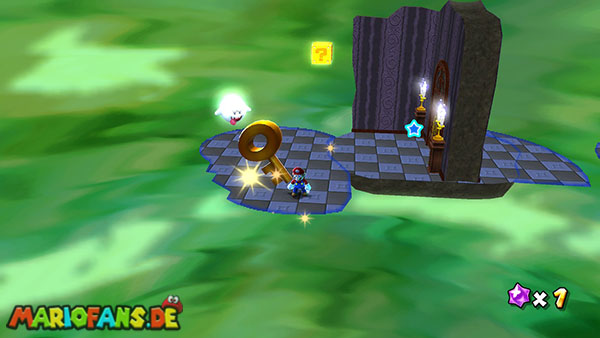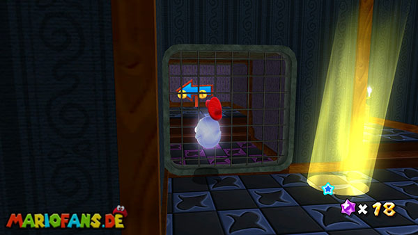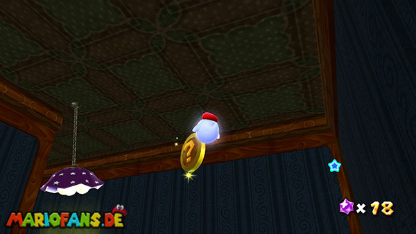 Im nun folgenden Raum sammelt ihr an den Wänden die Teil des Sternenringes ein. An der Decke könnt ihr außerdem in der Mitte des Raumes eine Stampfattacke benutzen um einen Geheimraum zu erreichen. Aktiviert zunächst den Schalter, dann sammelt ihr mit Hilfe der Sternenringe die Münzen ein. Kehrt schließlich nach unten zurück, und benutzt den Sternenring rechts an der Wand. Lauft nach vorne und nach rechts, springt nach unten zu dem Schlüssel, visiert jedoch bereits vorher den blauen Stern an. Sobald ihr den Schlüssel habt drückt ihr schnell die A-Taste damit ihr vom Stern angezogen werdet, bevor ihr nach unten fällt. Weiter geht es in das Gebäude, die beiden Geister lockt ihr in das Licht, sofern sie euch Probleme machen.