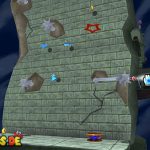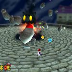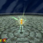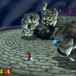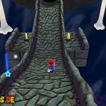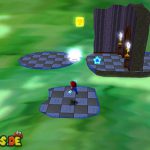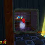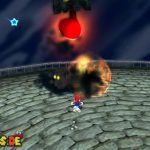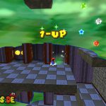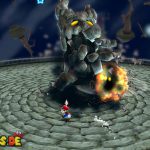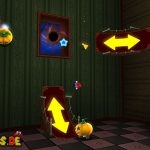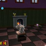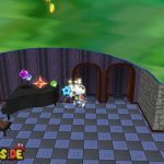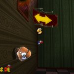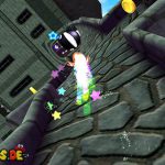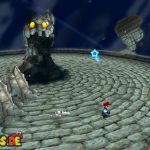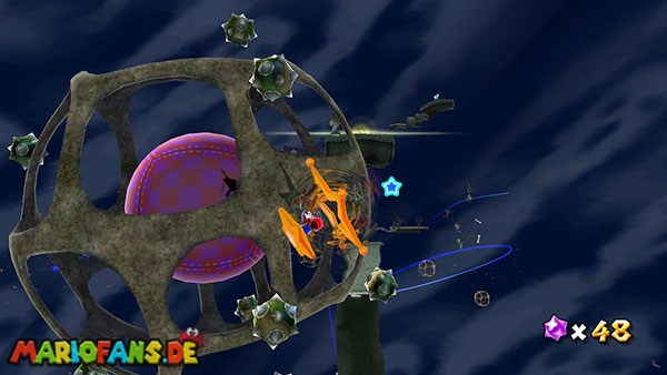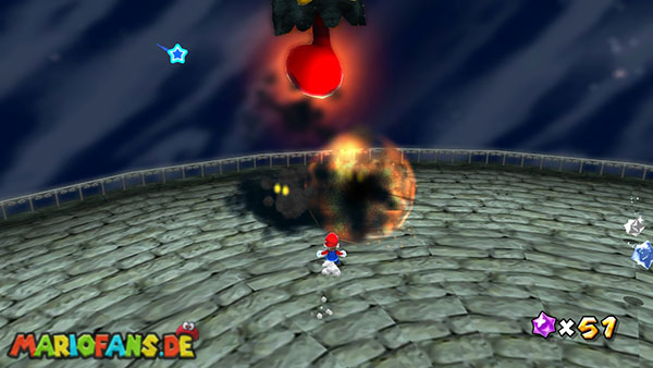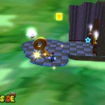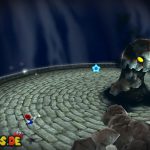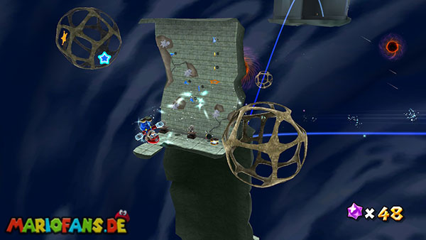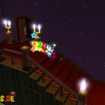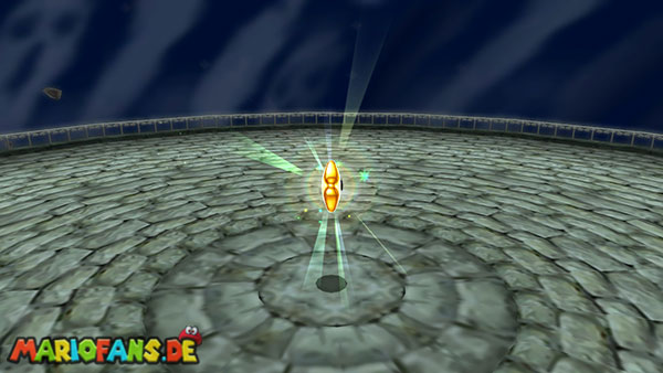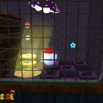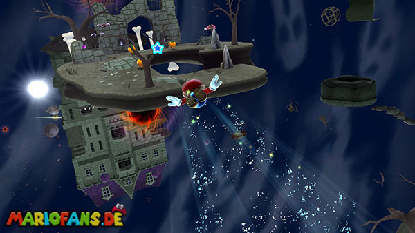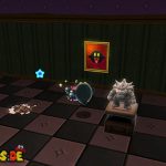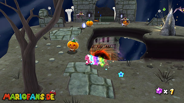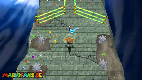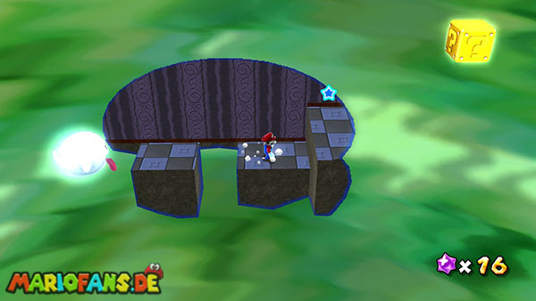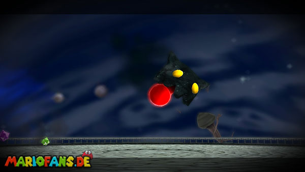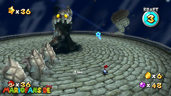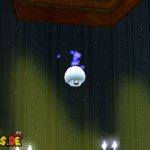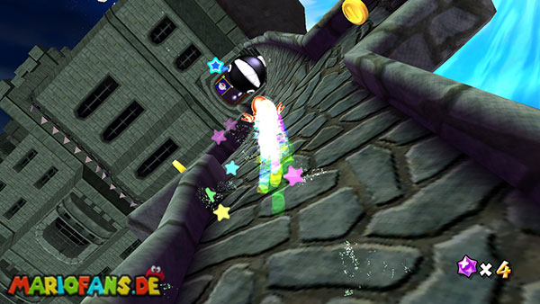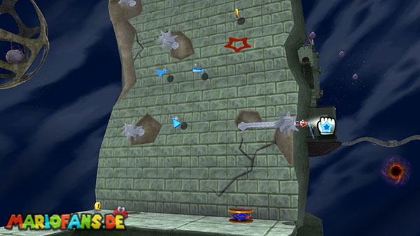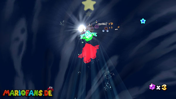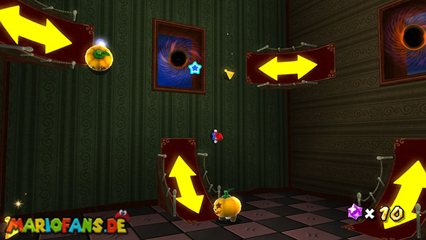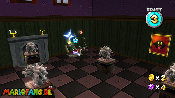 Lauft wie gewohnt zur Unterseite des Raumschiffes, und benutzt den Sternenring. Weiter geht es geradeaus und über die Brücke, auf der Hälfte des Weges klettert ihr schnell auf der Seite nach oben, und wartet bis die schwarze Kugel vorbeigerollt ist. Weiter vorne landet ihr wiederum im Inneren des Gebäudes. Lauft zu dem Bild und lasst euch von dem schwarzen Geist verfolgen. Ihn attackiert ihr mit einer Drehattacke, und könnt ihn so gegen ein der Statuen schleudern. Die vier Statuen im Raum enthalten nur Items, links im Kamin solltet ihr die Statue zerstören damit ihr nach draußen kommt. Benutzt nicht gleich den Sternenring sondern lauft noch nach oben, damit ihr euch aus der Box einige kleinere Sterne schnappen könnt.