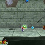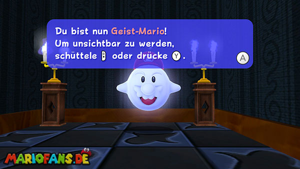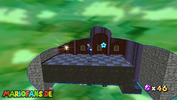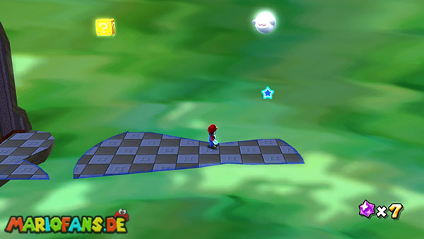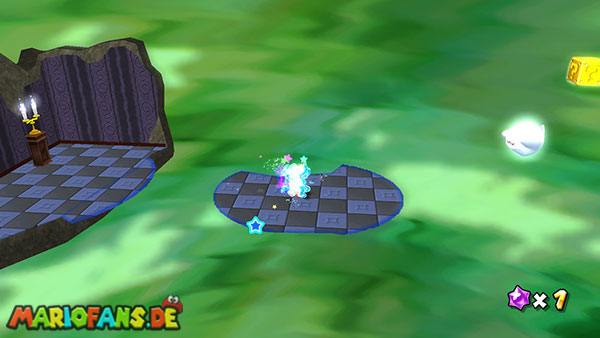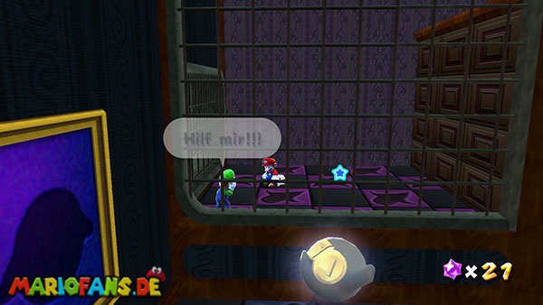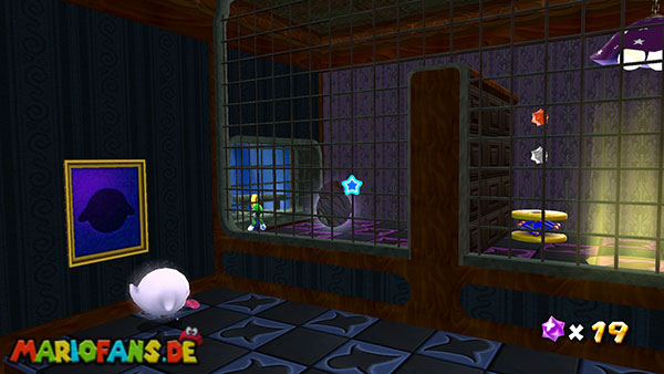 Weiter vorne im Raum aktiviert ihr links das Fragezeichen, und ein Geister-Pilz taucht auf. Als Geist-Mario schwebt ihr nun im Raum nach oben, und aktiviert die andere ?-Münze, weiter unten taucht somit aus dem Bild ein Extra-Leben auf. Weiter geht es durch das Gitter, ihr müsst euch jedoch unsichtbar machen damit ihr durchkommt. (Schüttelt dazu die Fernbedienung) Im nun folgenden Raum schwebt ihr durch das Gitter zu Luigi. Haltet euch rechts und fliegt in den Lichtschein damit ihr zurückverwandelt werdet. Nun gelangt ihr über die Sprungplattform nach links zu Luigi. Mit ihm müsst ihr noch reden, dann könnt ihr auch schon den Stern einsammeln.