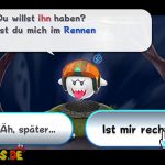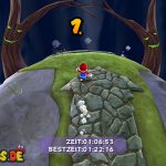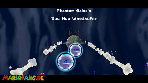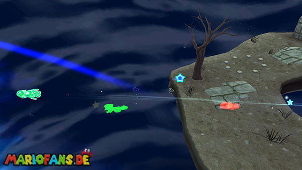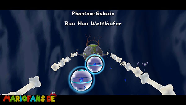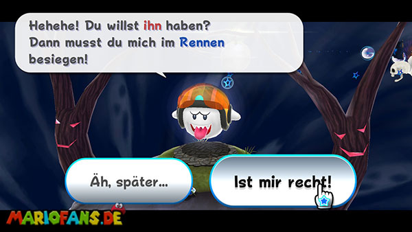 Gleich zu Beginn lauft ihr wieder nach unten, und benutzt den Sternenring, nun lauft ihr wieder zu dem Haus, ihr könnt es dieses Mal jedoch nur mit Hilfe der blauen Sterne erreichen. Dummerweise ist der Eingang versperrt, ihr müsst also den Sternenring vor der Tür benutzen. Durchsucht zunächst den Planeten und sammelt möglichst viele kleine Sterne ein, bevor ihr mit dem Geist redet. Noch bevor das Rennen beginnt zielt ihr nach links zu dem ersten blauen Stern. Währen des Rennens ist es wichtig dass ihr blitzschnell von einem Stern zum nächsten reist, visiert dazu schnell den jeweiligen Stern an, und hält die A-Taste gedrückt. Haltet euch die meiste Zeit eher seitlich, und weicht den Hindernissen so gut es geht aus. Gegen Ende erwarten euch einige explosive Gegenstände. Schießt diese bereits vorher mit Sternen ab, dann machen sie euch weniger Probleme. Benutzt außerdem die Z-Taste des Nunchucks damit ihr schneller landet. Am Ende lauft ihr auf dem Planeten nach oben um das Rennen zu beenden. Eure Belohnung ist natürlich, wie sollte es auch anders sein, ein neuer Stern.