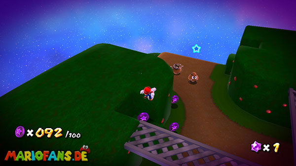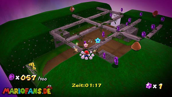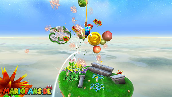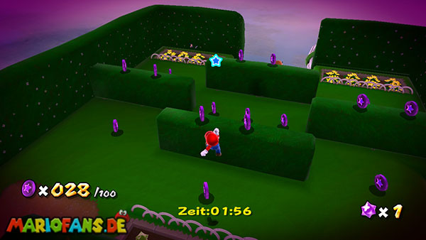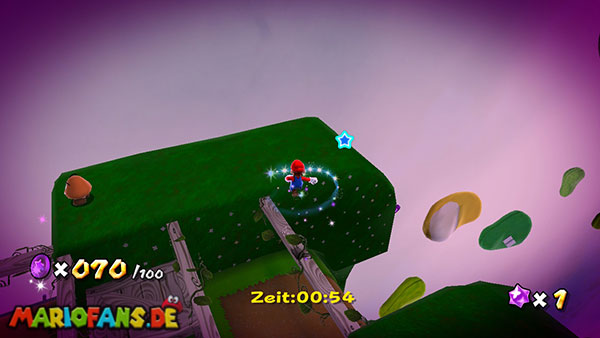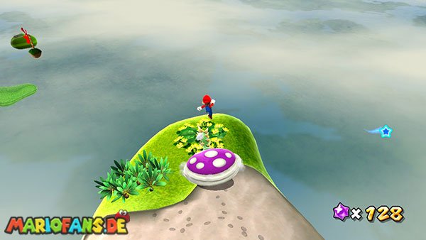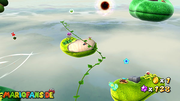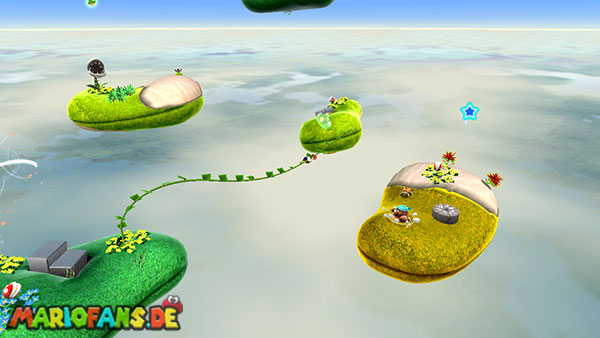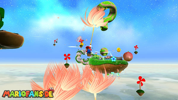 Auf der ersten Insel lauft ihr zur Unterseite, und holt euch aus den Kristallen einige kleine Sterne. Kehrt auf die Oberseite zurück und lauft zu der rosafarbenen Blume. Schüttelt die Fernbedienung damit die Blüten nach oben schweben, dann springt ihr zu einer der Blüten. Ihr werdet automatisch zur nächsten Insel transportiert, bevor ihr jedoch zu niedrig schwebt solltet ihr die Fernbedienung erneut schütteln damit ihr wieder aufsteigt. (das funktioniert jedoch nur 3 Mal) Erledigt die Schnapp-Piranhas und benutzt wiederum die Blüte um weiter zu kommen. Auf den nun folgenden Inseln kommt ihr somit immer über die Blumen weiter, oder ihr müsst die Schnapp-Piranhas besiegen um über eine Ranke weiter zu kommen. Auf der Insel mit der ersten lilafarbenen Schnapp-Piranha geht es jedoch auf der Unterseite über eine Ranke weiter, auf der nun folgenden Insel besiegt ihr die lilafarbenen Pflanze damit sie sich in einen Sternenring verwandelt.