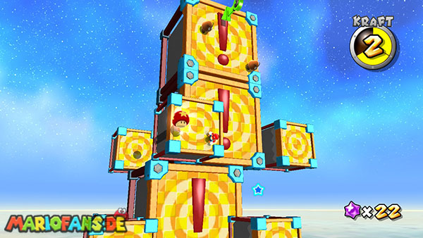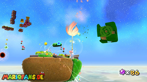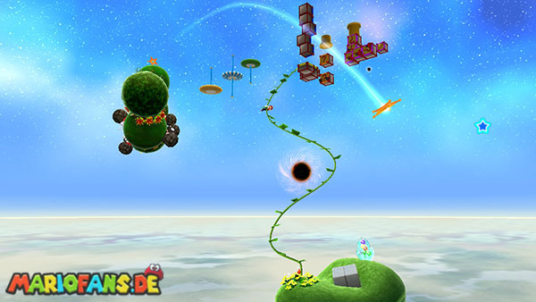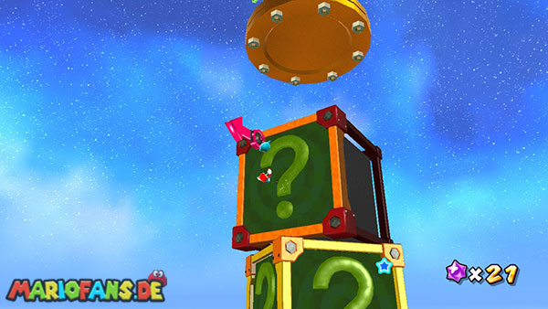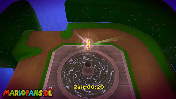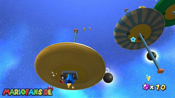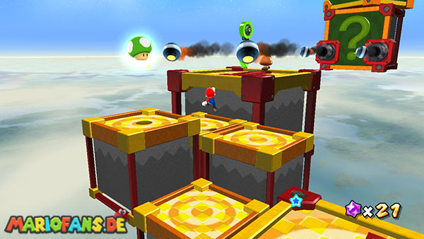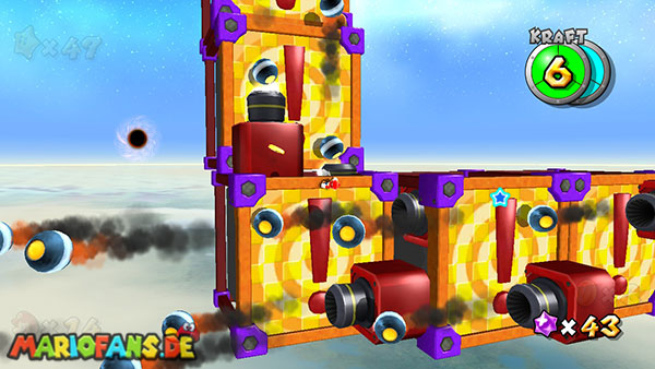 Lauft geradeaus und klettert links nach oben, hier schnappt ihr euch das Extra-Leben. Seid vorsichtig wenn ihr auf die nächste Plattform klettert, da euch einige Kanonenkugeln entgegenfliegen. Oben angekommen benutzt ihr bei dem Pfeil eine Drehattacke, und werdet somit von der nächsten Plattform angezogen. Nun folgt ihr zunächst immer den Pfeilen, achtet immer darauf dass ihr nicht nach unten fallen dürft, da sich im Hintergrund ein schwarzes Loch befindet. Haltet außerdem die Augen nach einem roten Pilz offen, ihn erreicht ihr über die kleineren Würfel die sich von rechts nach links bewegen. Sobald ihr bei den Kanonenkugeln angelangt seid müsst ihr am Weg nach unten besonders vorsichtig sein, bleibt immer zwischen den beiden Kanonen damit ihr von den Kugeln nicht getroffen werdet. Am Ende geht es schließlich noch nach rechts, wo ihr den Stern bekommt. (Passt jedoch auf da ihr zu der letzten Plattform springen müsst, fallt also nicht nach unten)