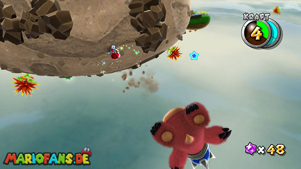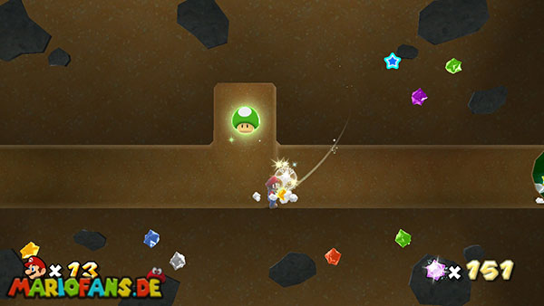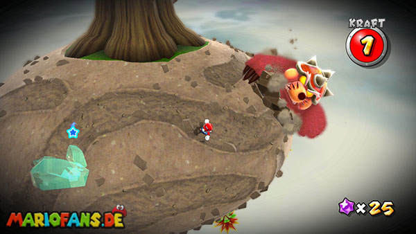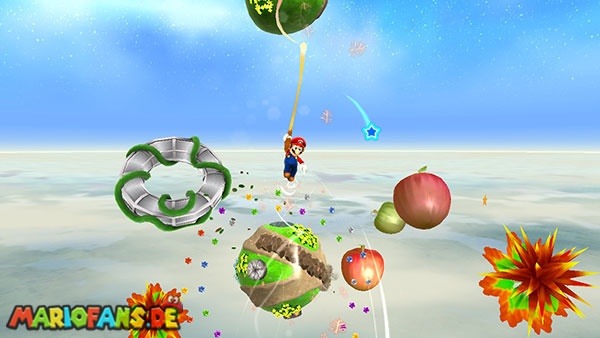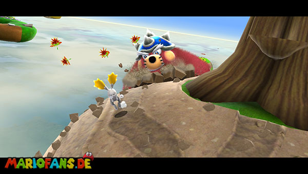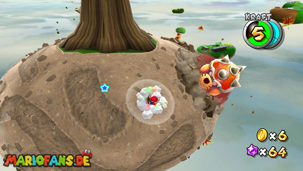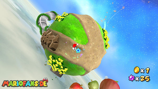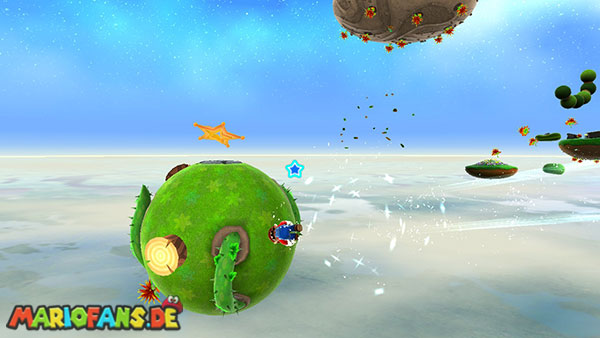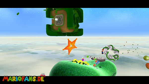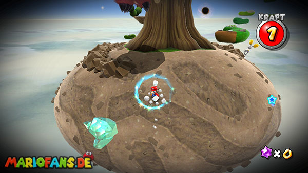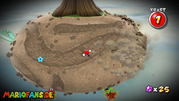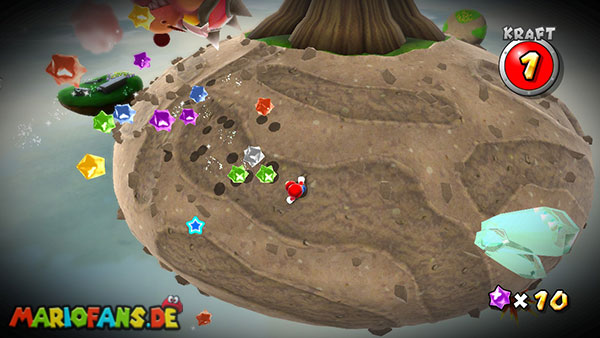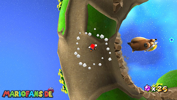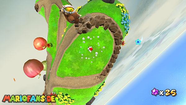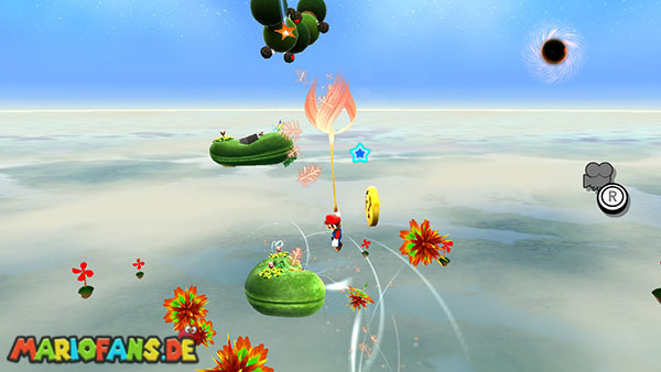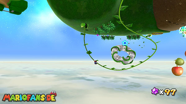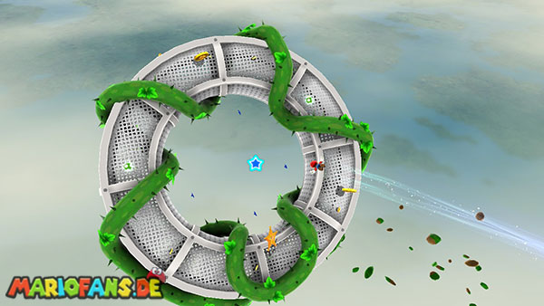 Benutzt zunächst die Blüte um weiter zu kommen. Auf der nächsten Insel angekommen benutzt ihr wiederum die Ranken. Damit ihr am Ende den Sternenring erreicht dürft ihr in der Luft keine Drehattacke ausführen. Dreht euch einfach die Ranke nach oben und lasst euch am Ende nach rechts fallen, ihr solltet somit direkt im Sternenring landen. Auf dem nun folgendem Planetoiden achtet ihr auf die rollenden Steine. Lauft immer in dieselbe Richtung wie auch die Steine rollen, und durch die Lücke bei den stacheligen Blumen weiter. Am anderen Ende benutzt ihr den Sternenring.