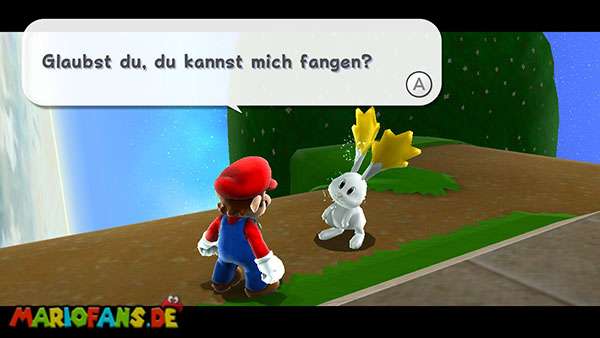 Nun kommt ihr auf einem leicht eckigen Planetoiden an. Redet mit dem Hasen, und ihr sollt ihn, wie könnte es auch anders sein, einfangen. Lauft ihm nach, und versucht so gut es geht Wege abzukürzen, damit ihr ihm hinterher kommt. Ihr könnt auch, wenn sich vor euch kein Objekt im Weg befindet, einen Weitsprung einsetzen. Haltet dazu im Laufen die Z-Taste am Nunchuck gedrückt und springt als nächstes, dann erreicht ihr den Hasen unter Umständen auch etwas schneller. (Sofern ihr nicht irgendwo dagegen springt) Habt ihr den Hasen erwischt bekommt ihr von ihm einen Stern.