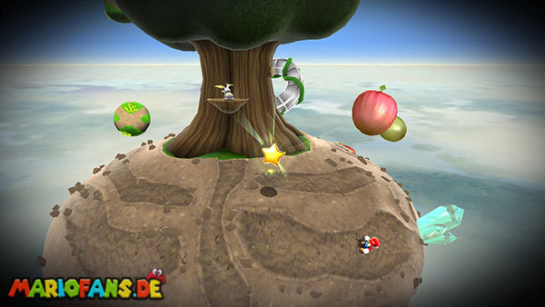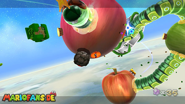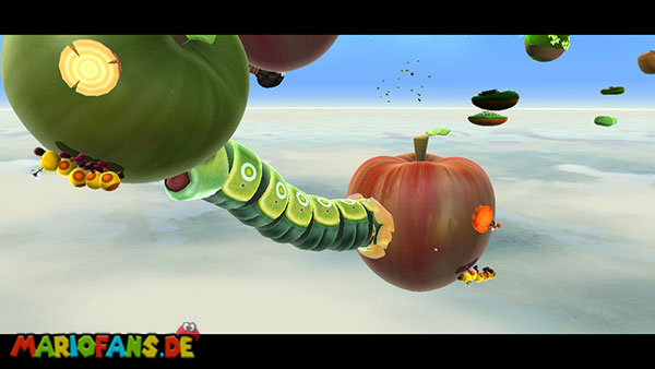 Fliegt zunächst von einer Insel zur nächsten, wiederum mit Hilfe der Blüten der rosafarbenen Blume. Auf dem runden Planeten am Ende benutzt ihr zunächst eine Stampfattacke und erledigt schließlich den Maulwurf. Somit sollte ein Sternenring auftauchen der euch weiter bringt. Auch auf dem nächsten Planeten befinden sich drei Maulwürfe. Benutzt wiederum in ihrer nähe eine Stampfattacke, und attackiert schließlich den herumzappelnden Maulwurf um ihn zu besiegen. Sind alle drei besiegt reist ihr über den Sternenring weiter. Auf den Äpfeln müsst ihr auf den Korken eine Stampfattacke ausführen, dann taucht ein Wurm auf, über den ihr auf den nächsten Apfel gelangt. Auf dem letzten Apfel gelangt ihr somit über den Wurm zum Sternenring.