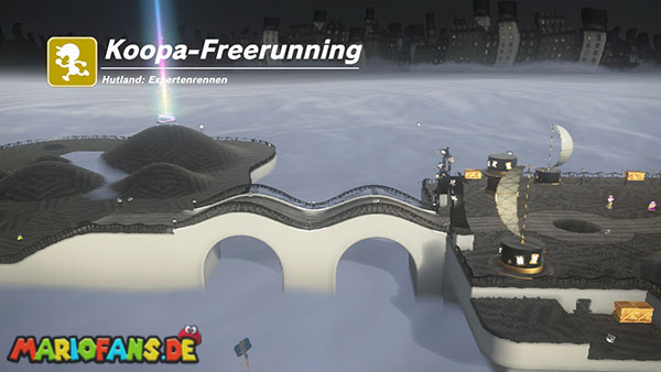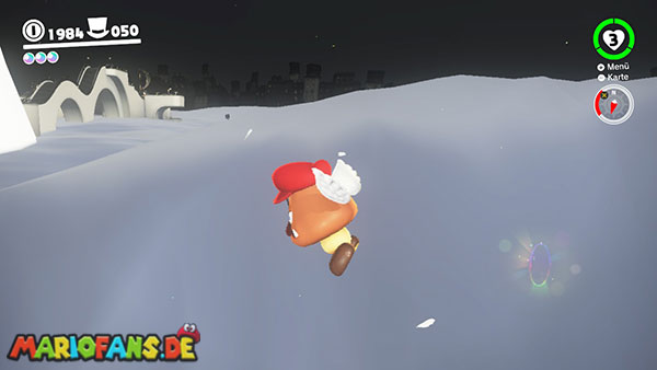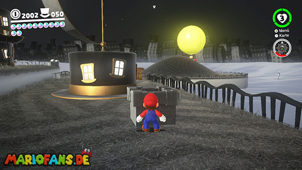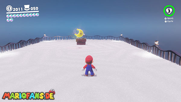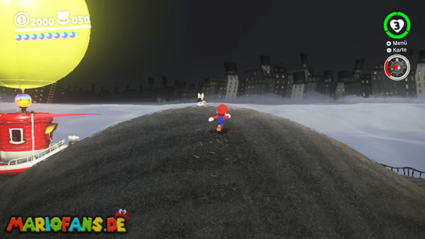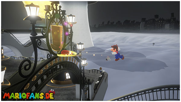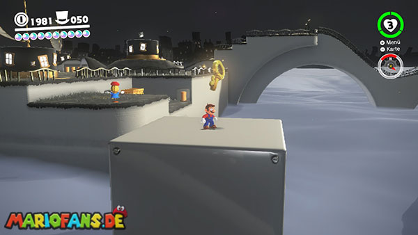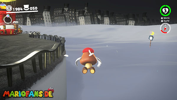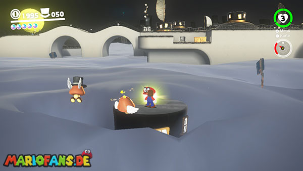 Am Hauptplatz musst du auf den Torbogen zum goldenen Hut. Wirf Cappy gegen den Hut damit der Power-Mond erscheint.